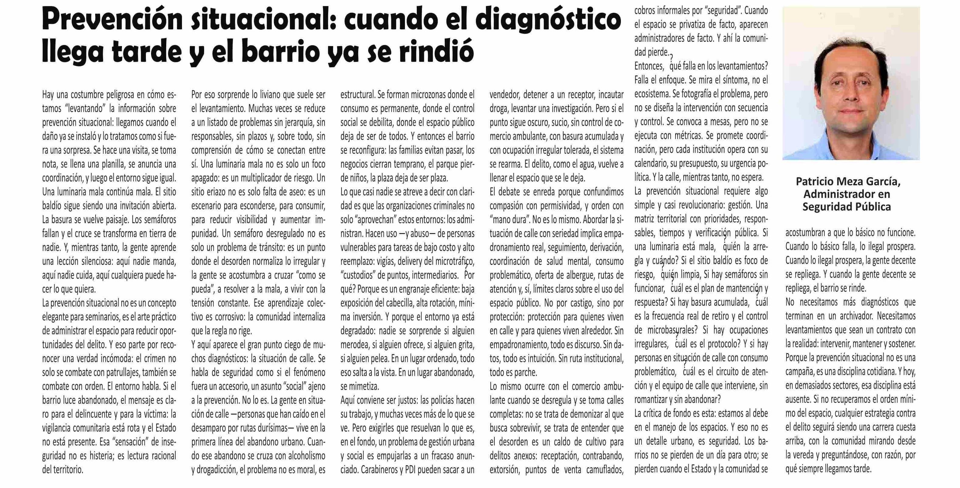 COLUMNAS DE OPINIÓN: Prevención situacional: cuando el diagnóstico llega tarde y el barrio ya se rindió