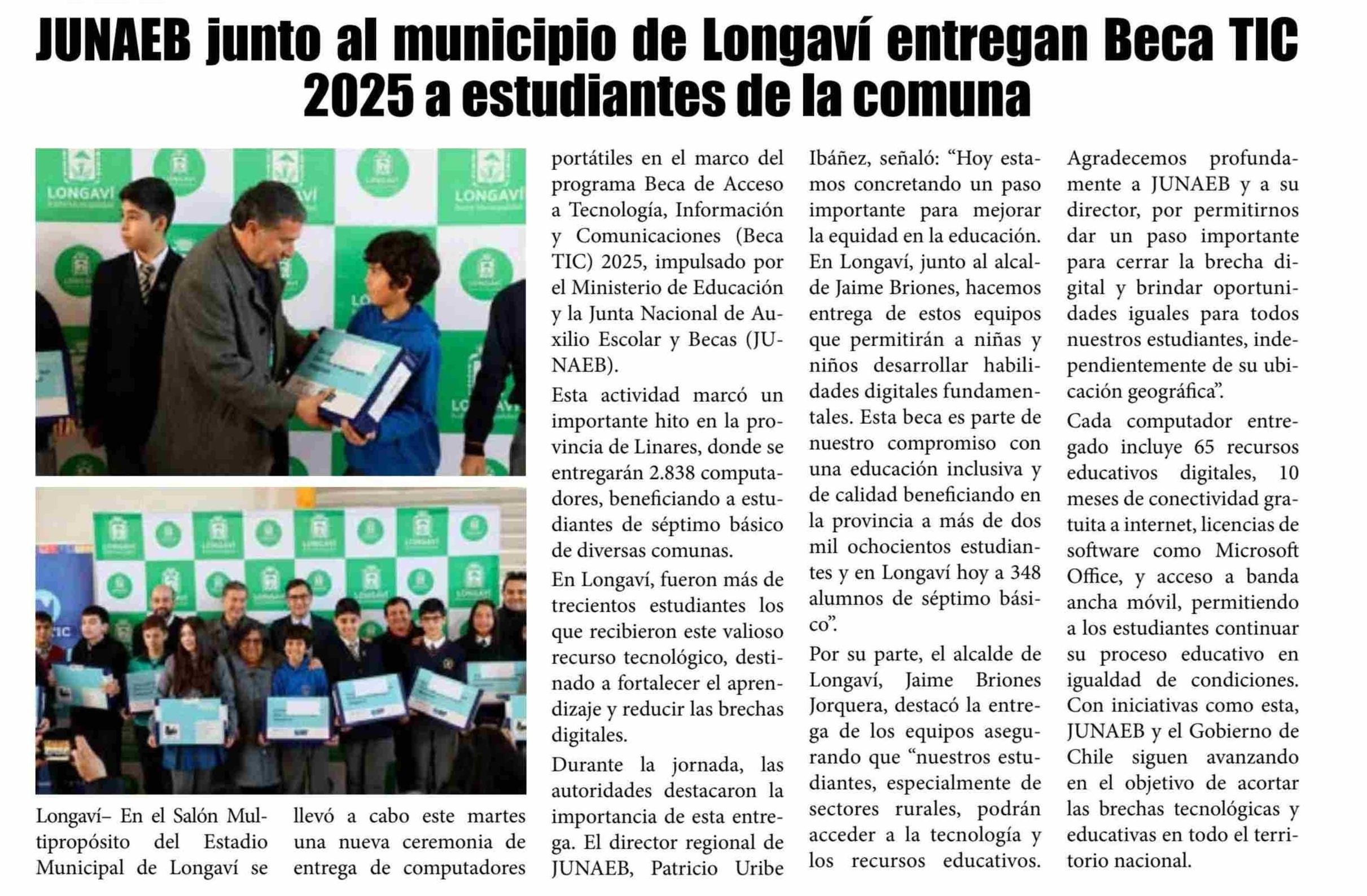 JUNAEB junto al municipio de Longaví entregan Beca TIC 2025 a estudiantes de la comuna