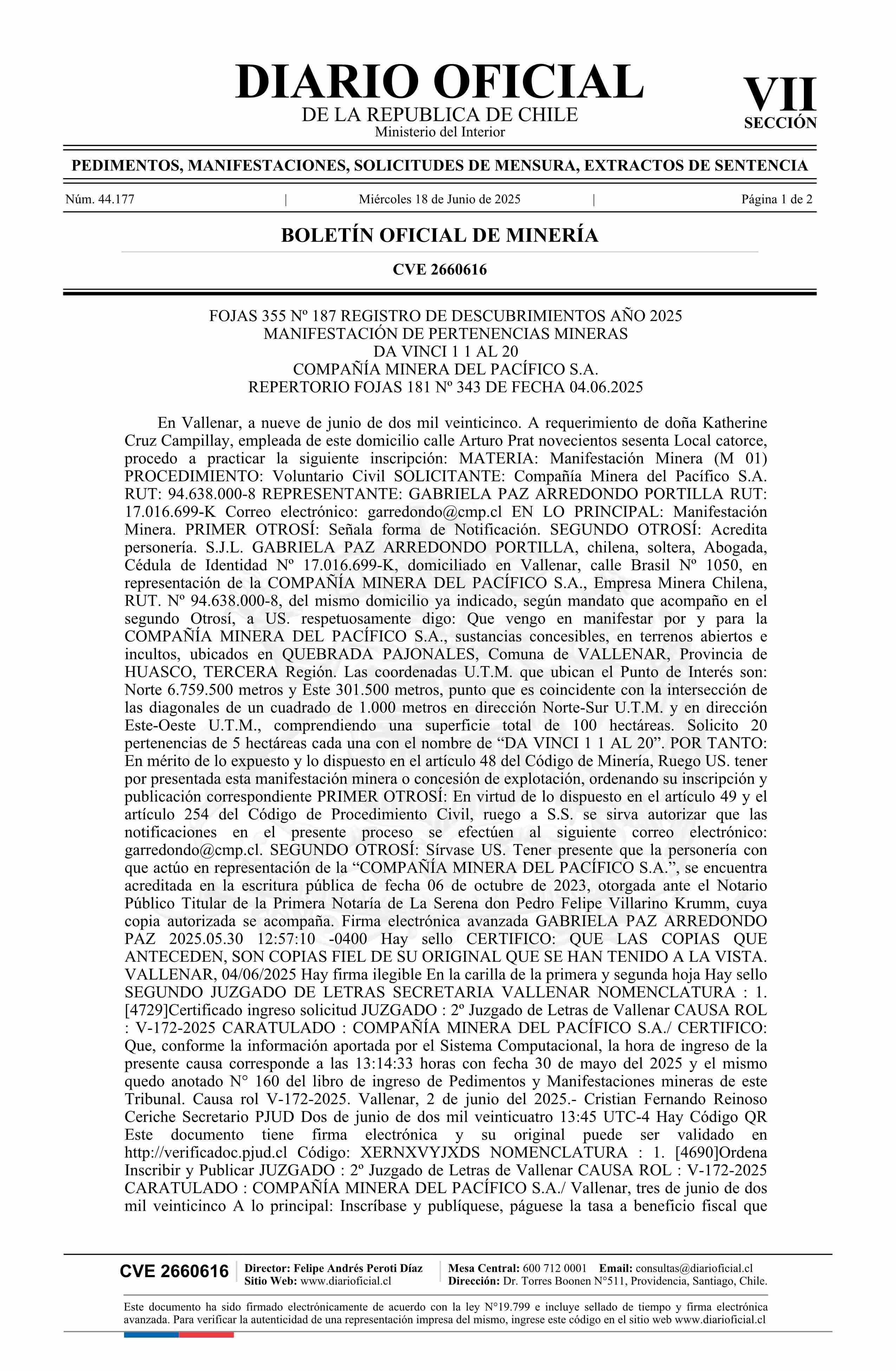 DA VINCI 1 1 AL 20 / Compañía Minera del Pacífico S.A.