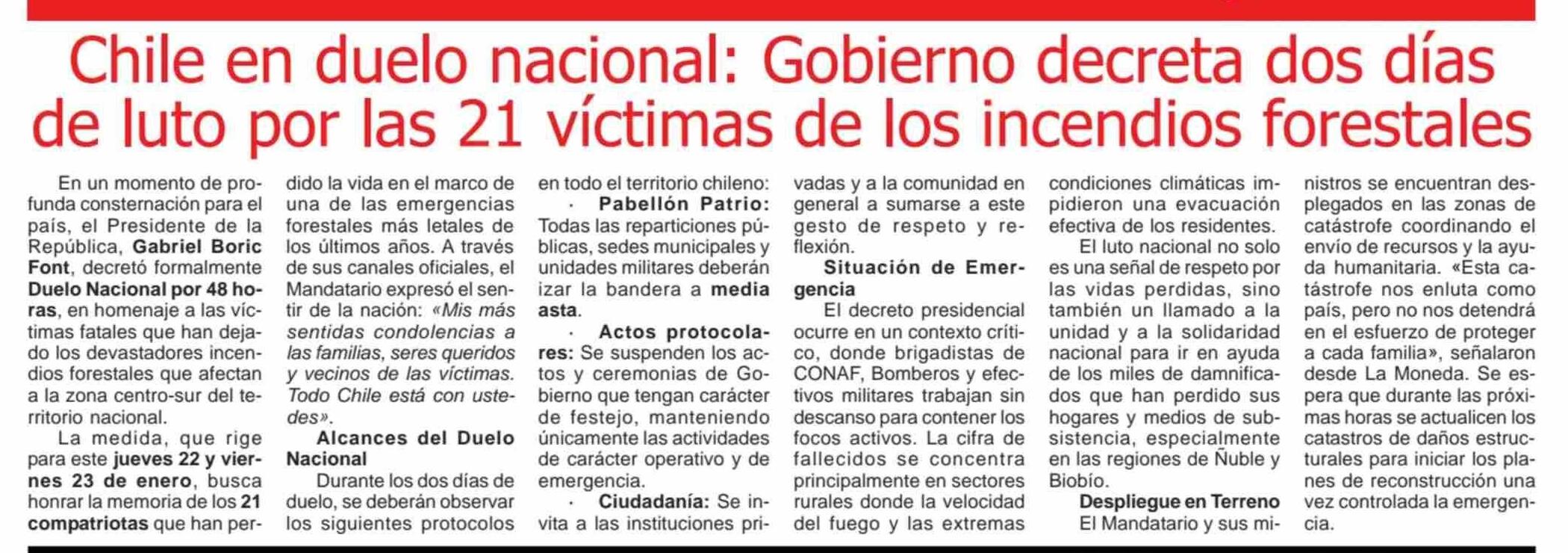 Chile en duelo nacional: Gobierno decreta dos días de luto por las 21 víctimas de los incendios forestales