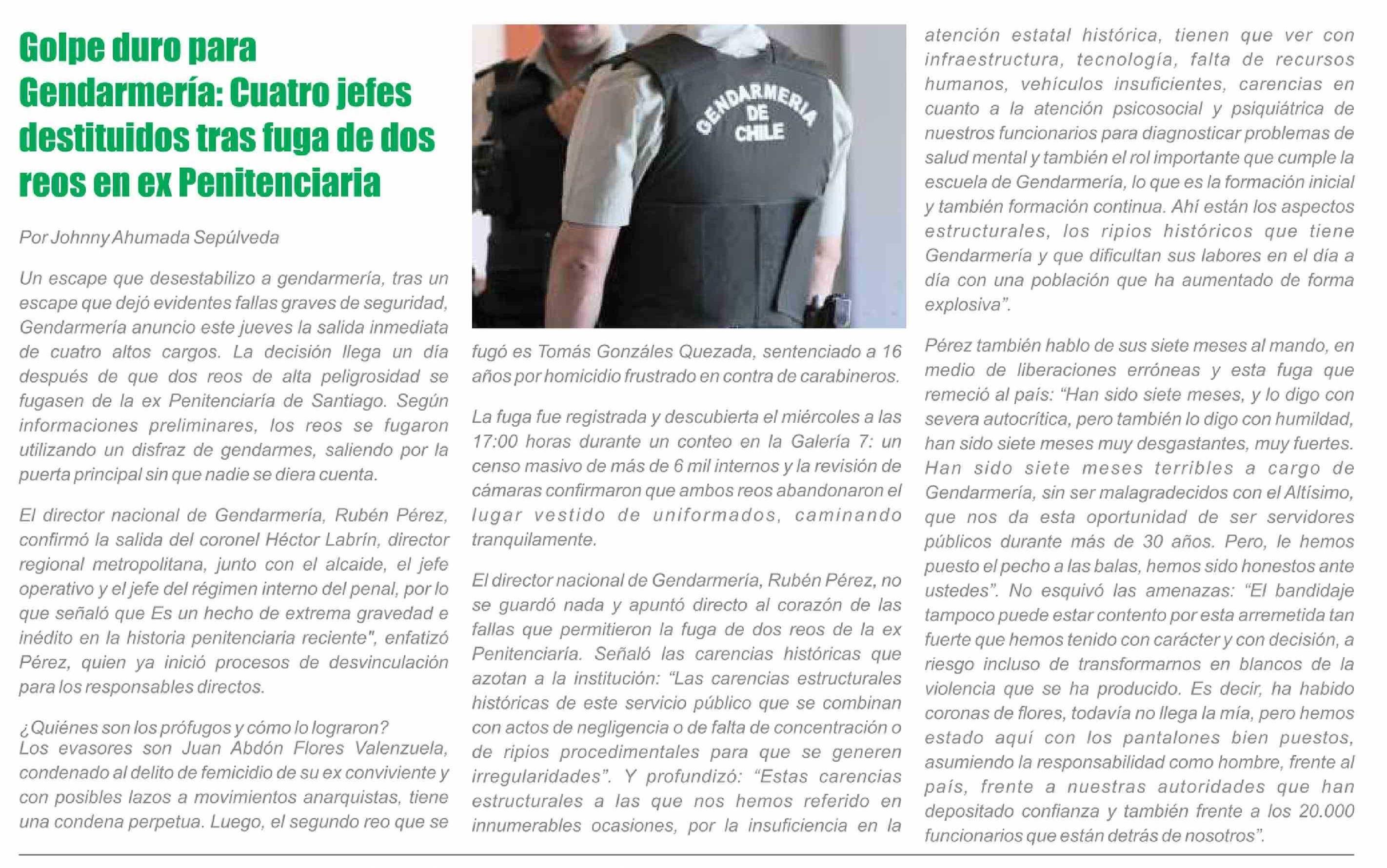 Golpe duro para Gendarmería: Cuatro jefes destituidos tras fuga de dos reos en ex Penitenciaria