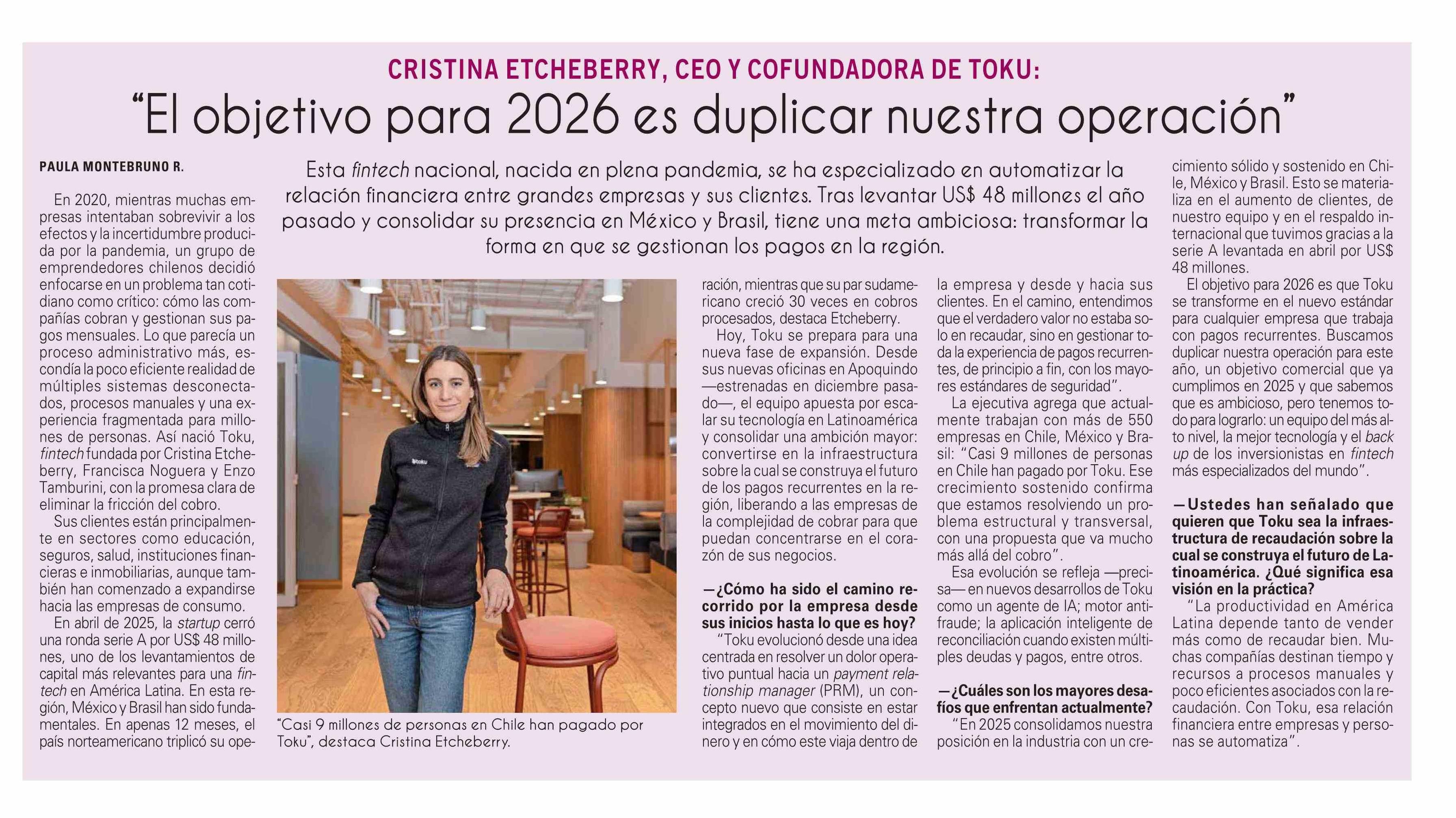 CRISTINA ETCHEBERRY, CEO Y COFUNDADORA DE TOKU: “El objetivo para 2026 es duplicar nuestra operación"