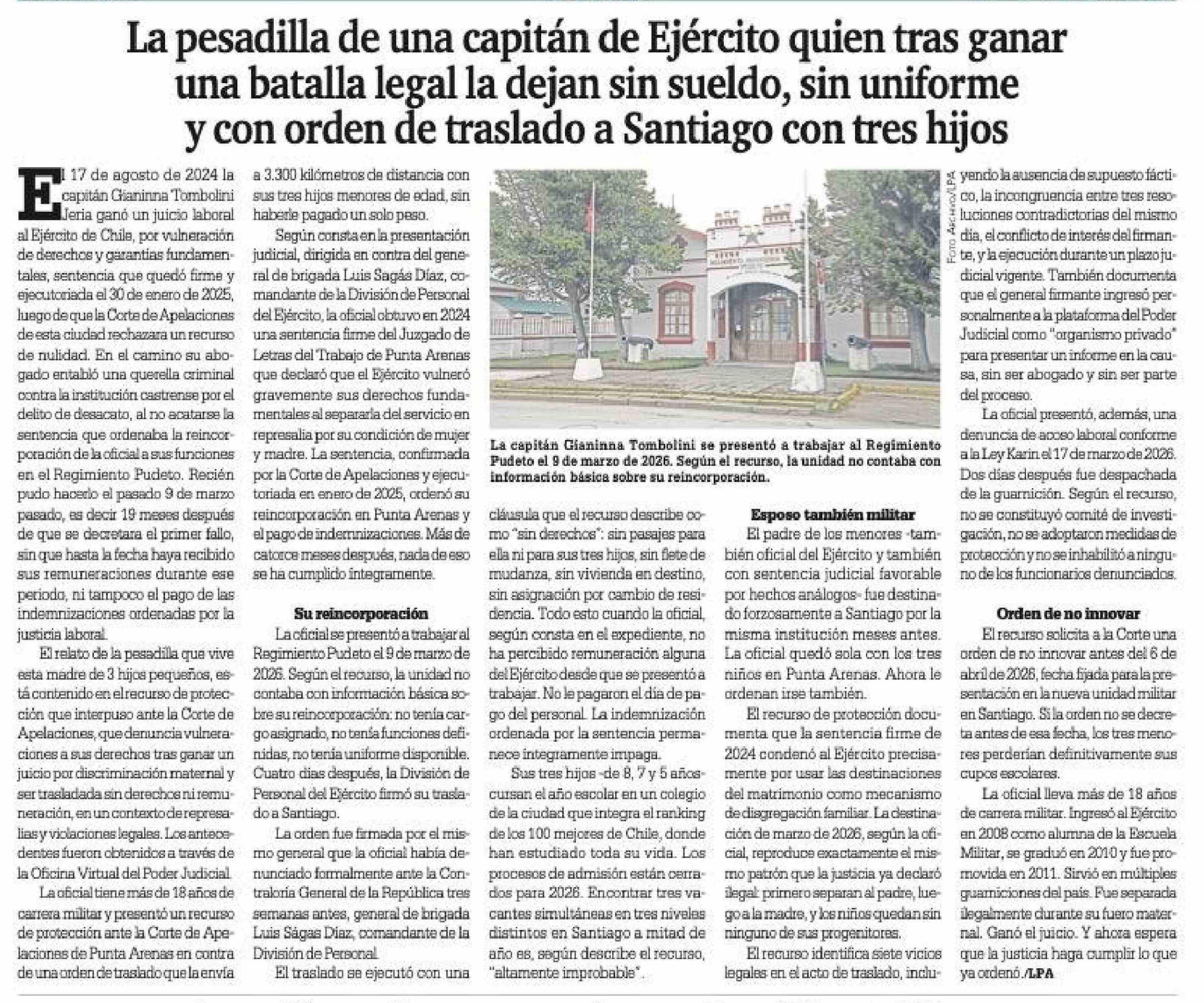 | Título: | La pesadilla de una capitán de Ejército quien tras ganar una batalla legal la dejan sin sueldo, sin uniforme y con orden de traslado a Santiago con tres hijos |