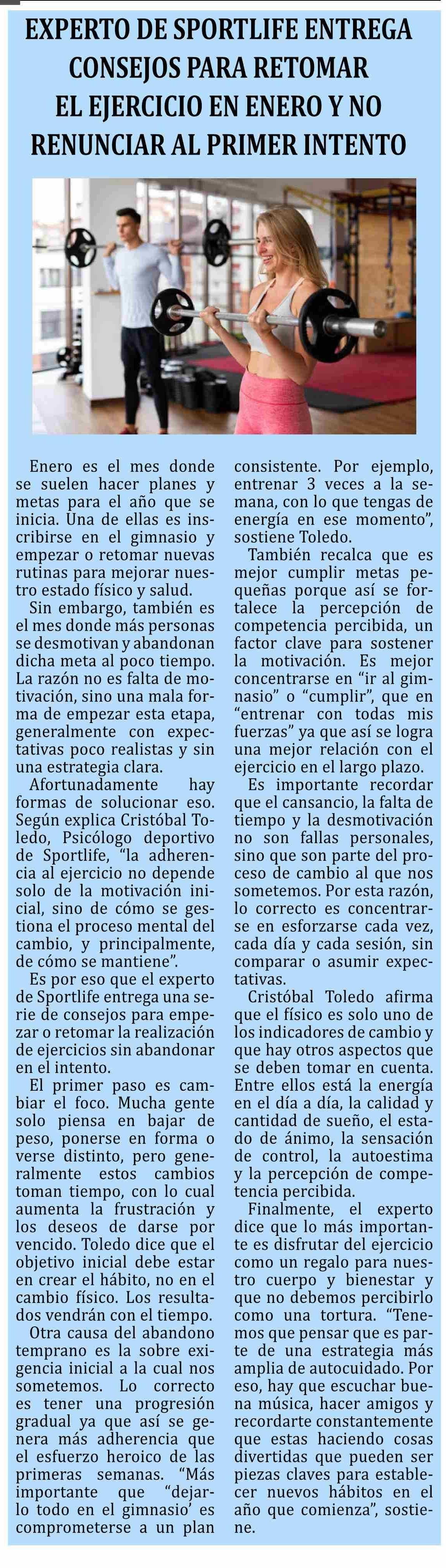Título: Columnas de Opinión: EXPERTO DE SPORTLIFE ENTREGA CONSEJOS PARA RETOMAR EL EJERCICIO EN ENERO Y NO RENUNCIAR AL PRIMER INTENTO