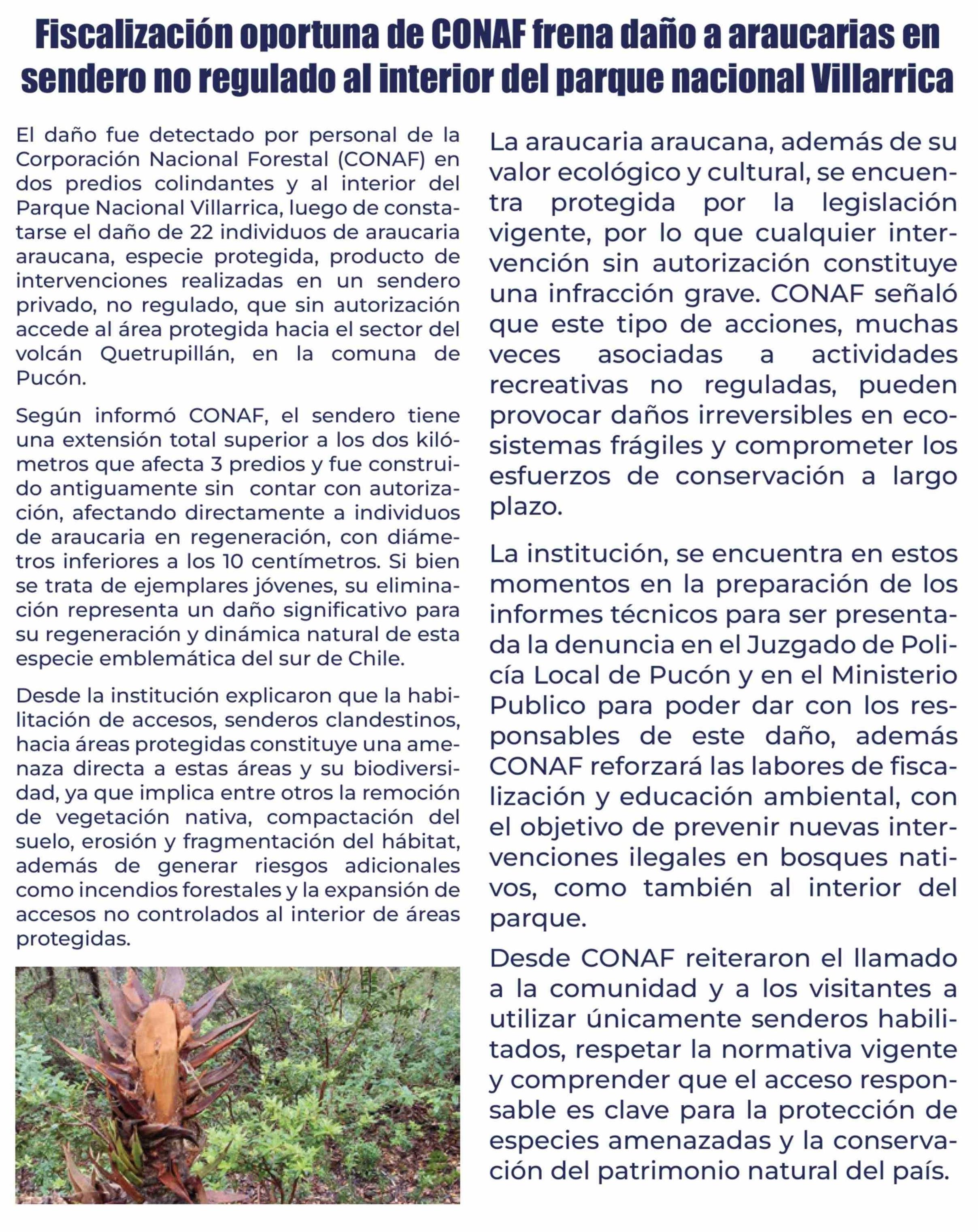 Fiscalización oportuna de CONAF frena daño a araucarias en sendero no regulado al interior del parque nacional Villarrica