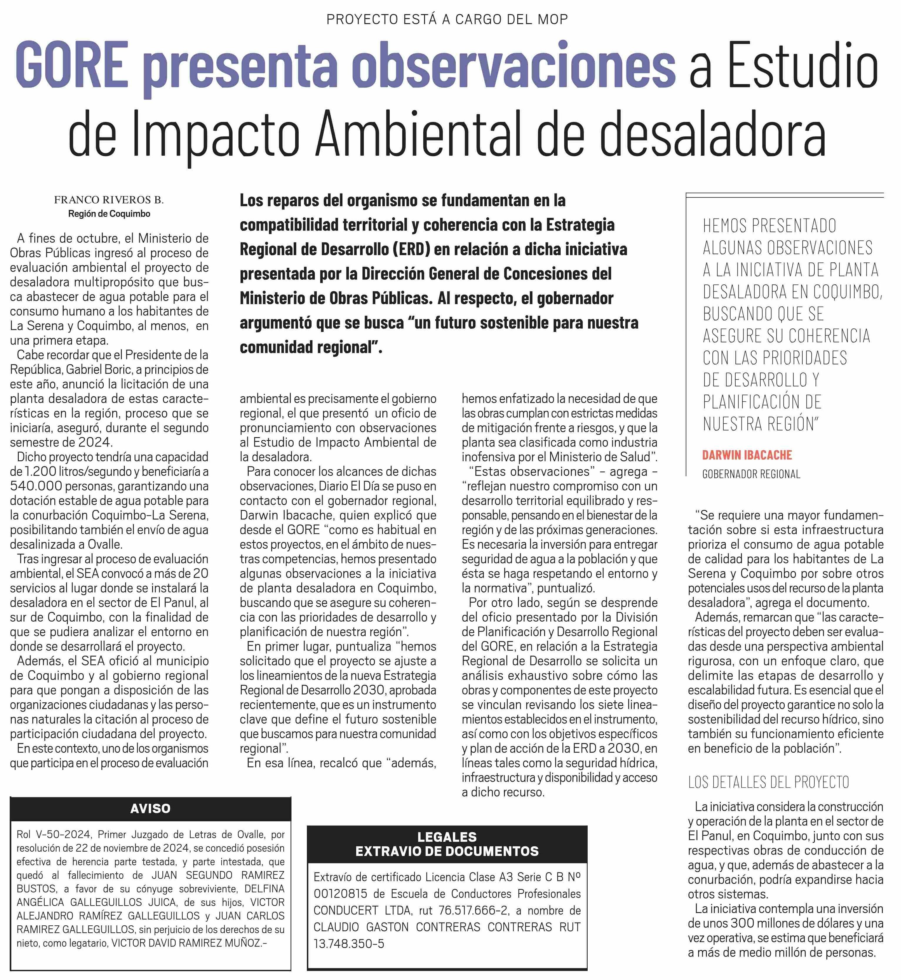 GORE presenta observaciones a Estudio de Impacto Ambiental de desaladora