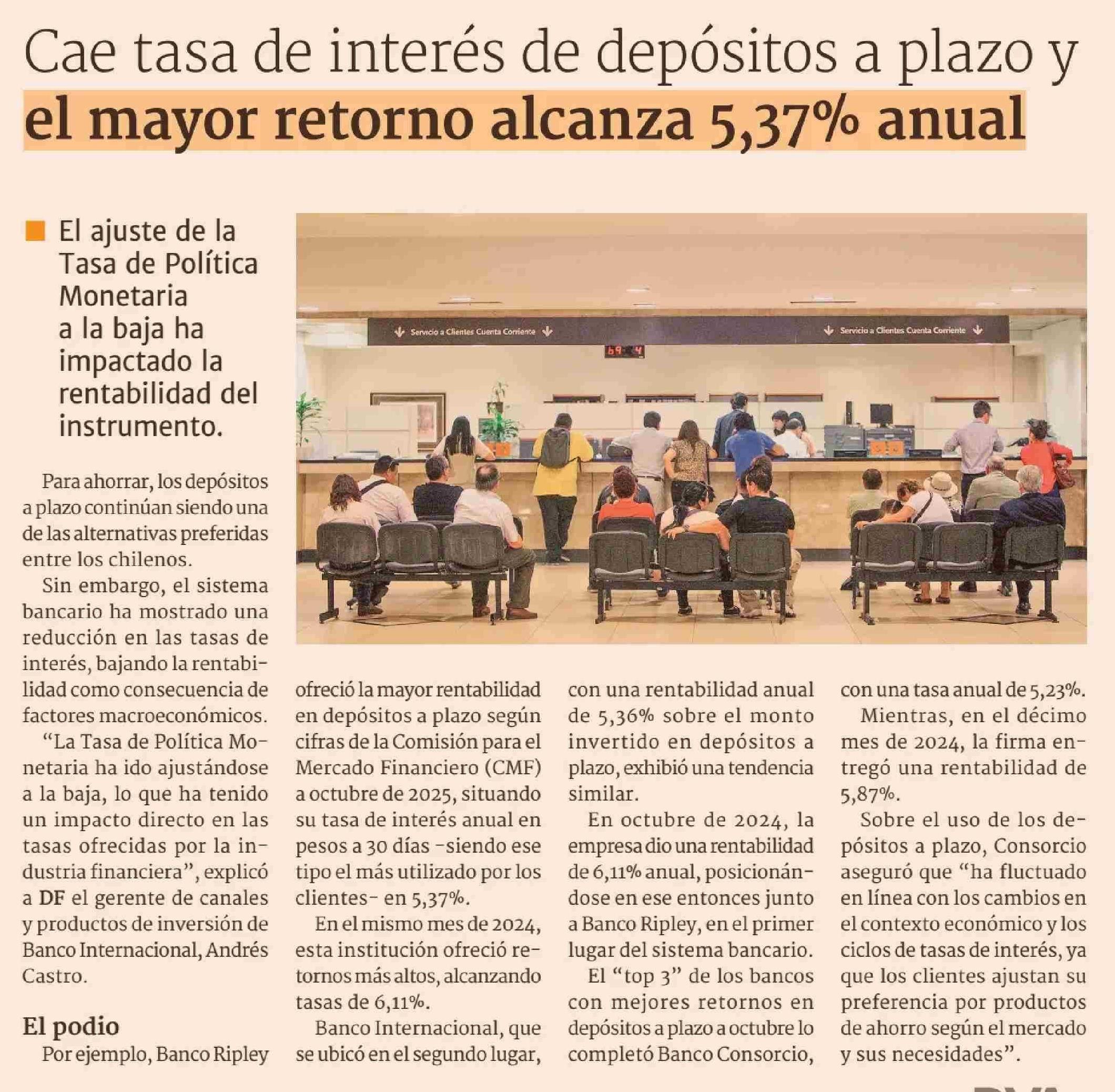 Cae tasa de interés de depósitos a plazo y el mayor retorno alcanza 5,37% anual