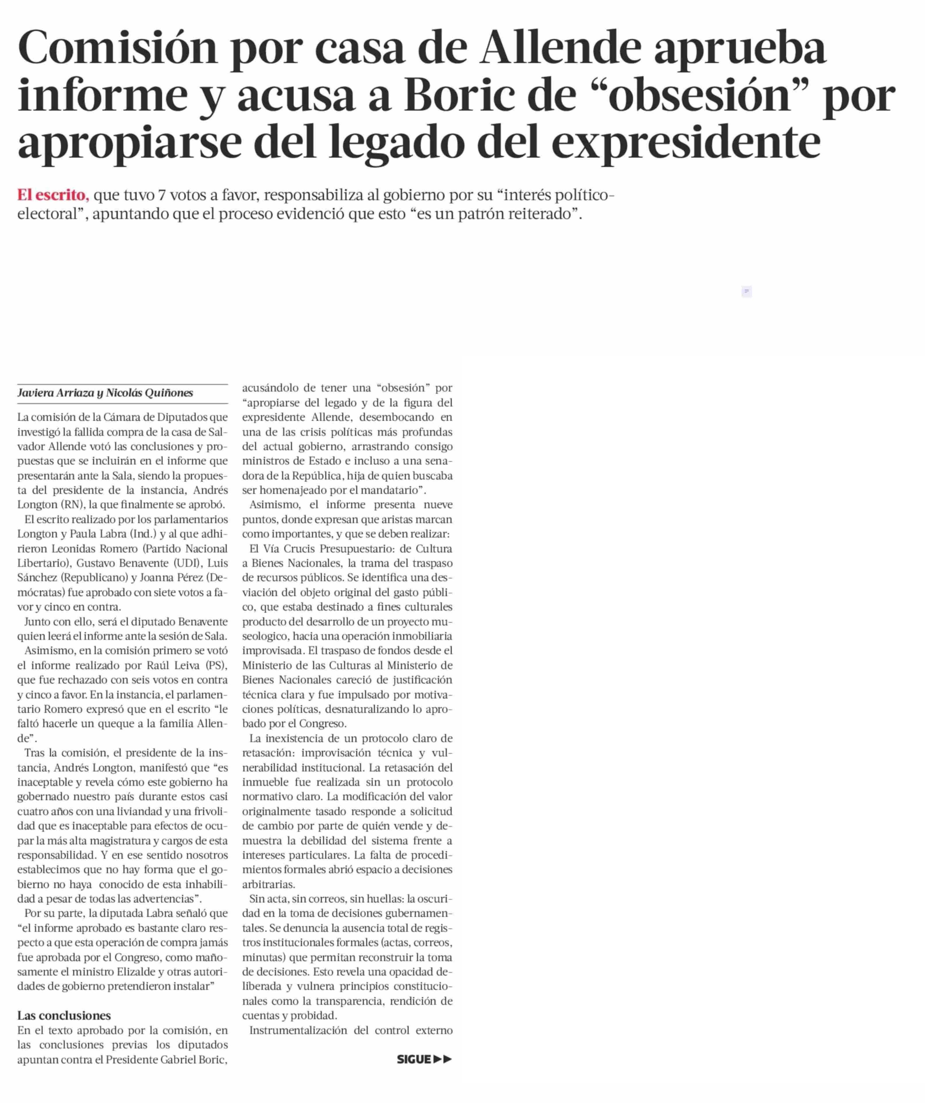 Comisión por casa de Allende aprueba informe y acusa a Boric de “obsesión” por apropiarse del legado del expresidente