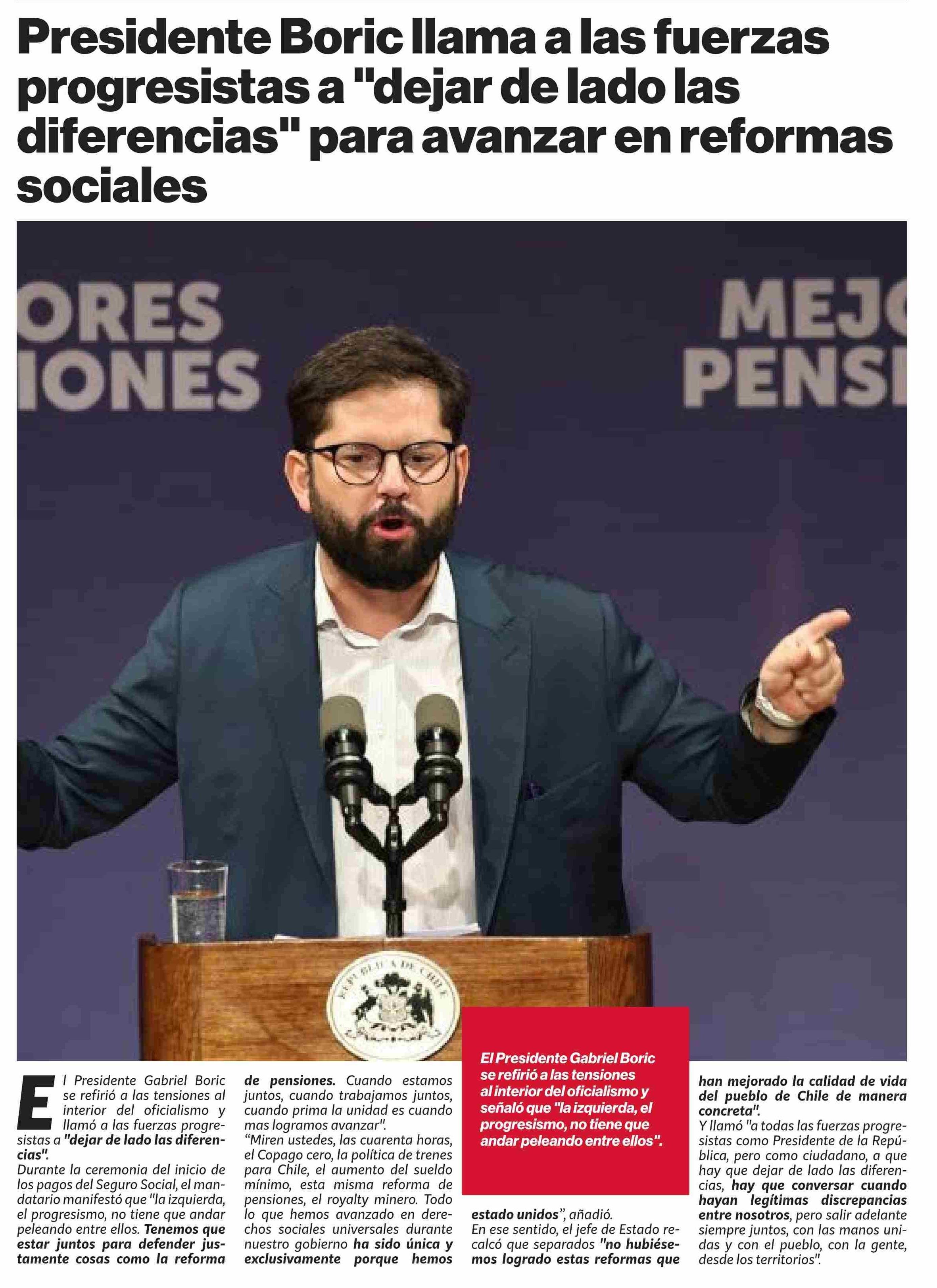 Presidente Boric llama a las fuerzas progresistas a “dejar de lado las diferencias” para avanzar en reformas