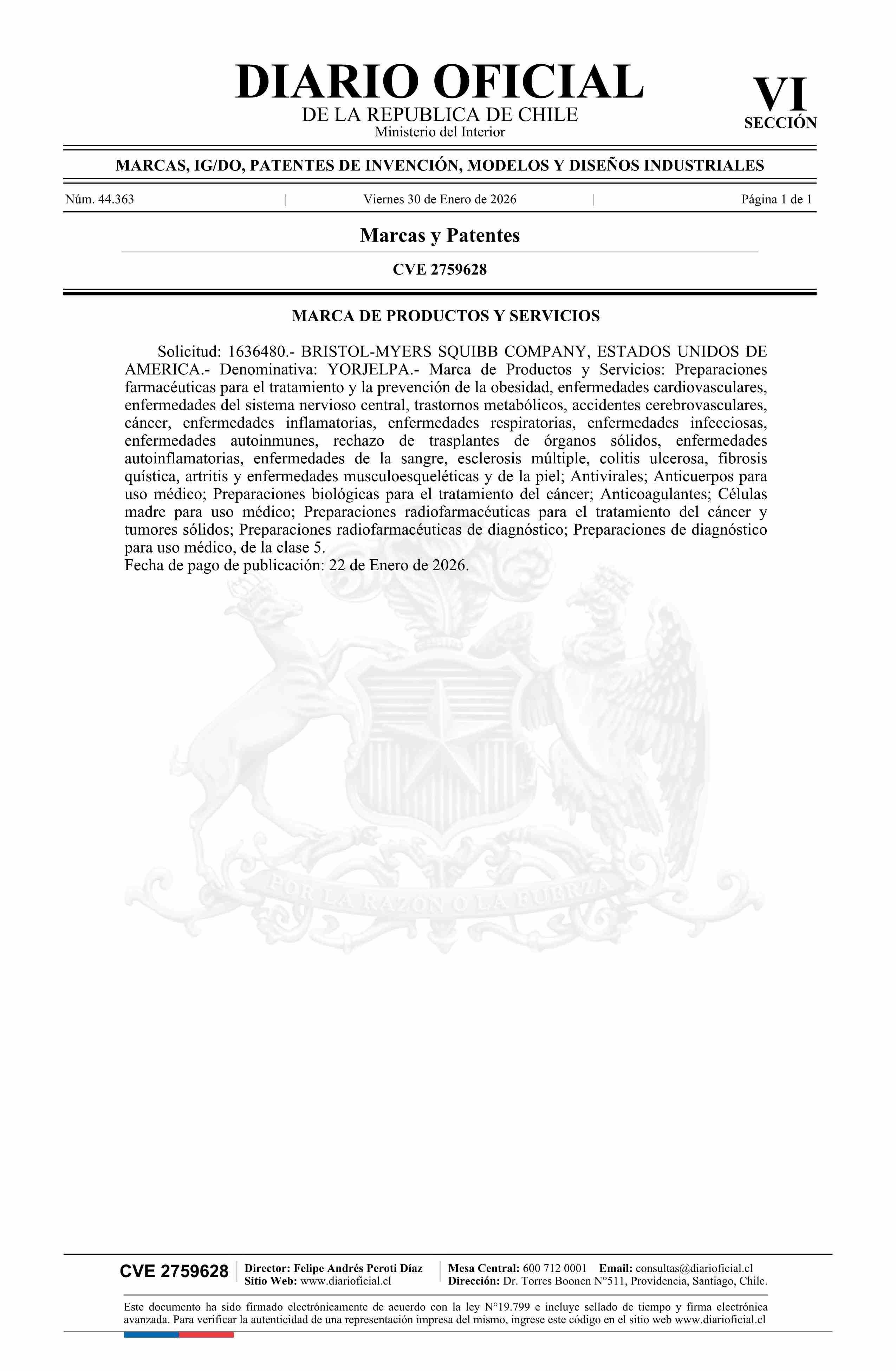 Diario Oficial Edición Electrónica (Diario Oficial de Chile - 6 Marcas Y Patentes)