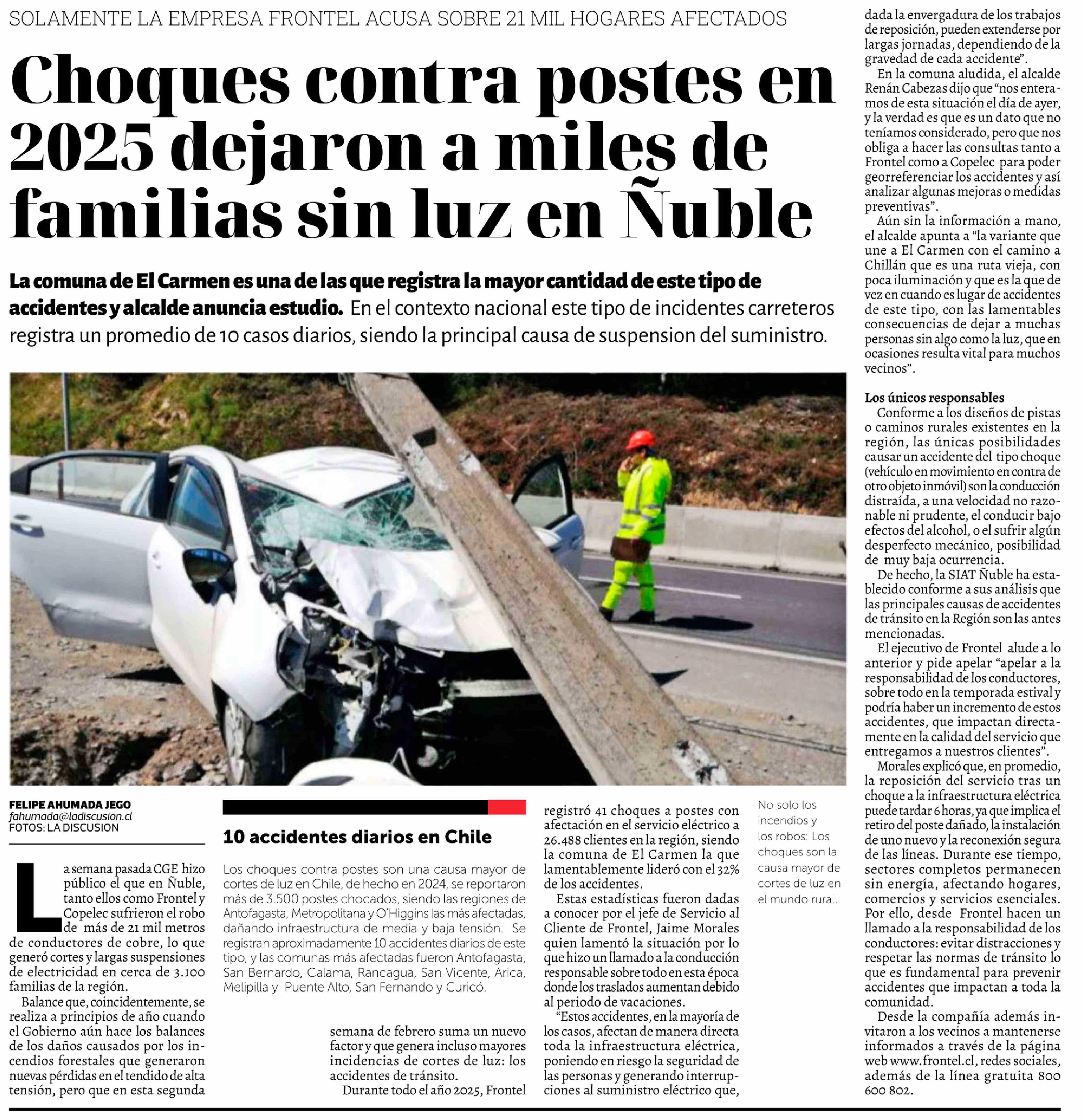 Choques contra postes en 2025 dejaron a miles de familias sin luz en Nuble