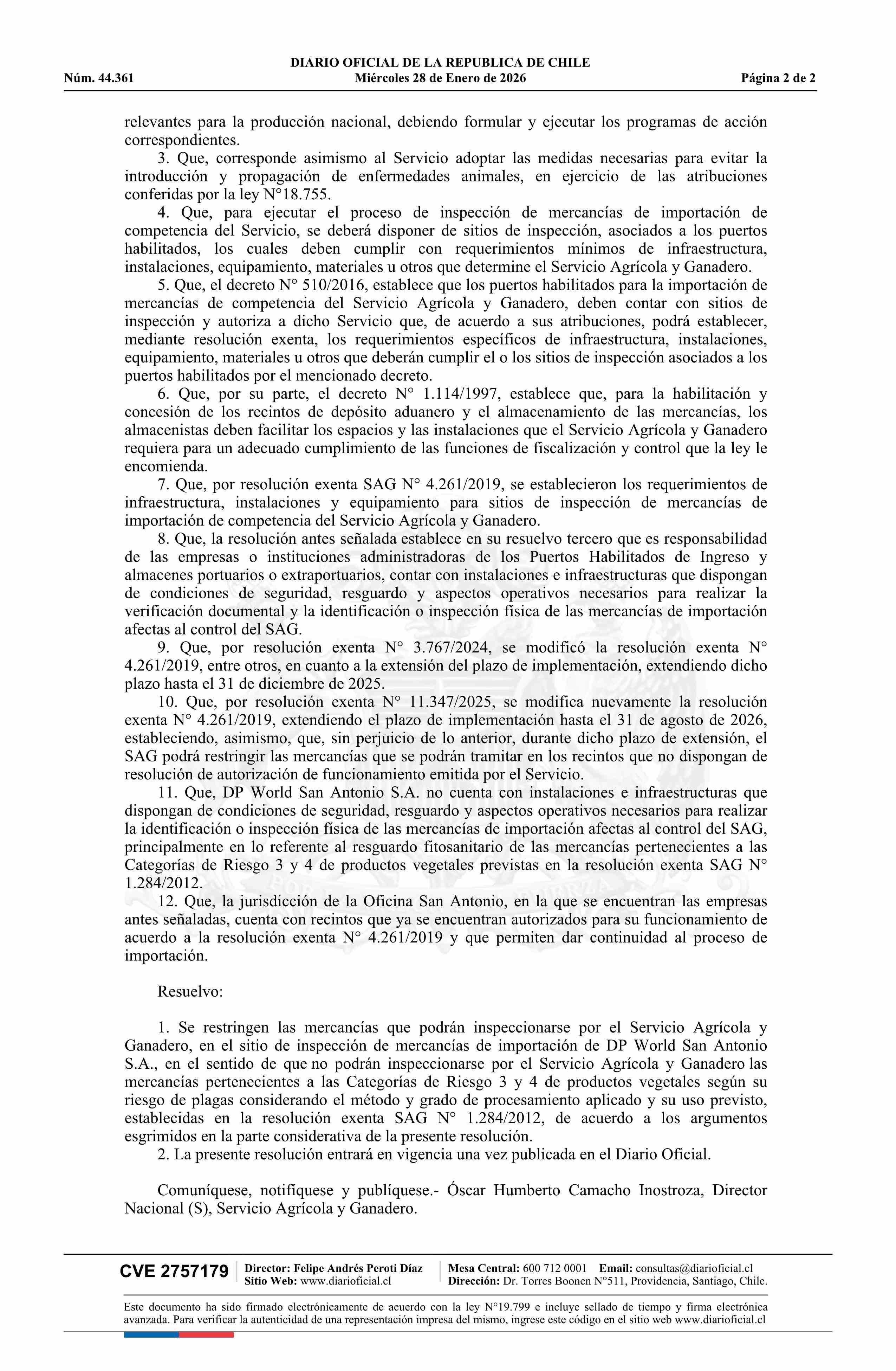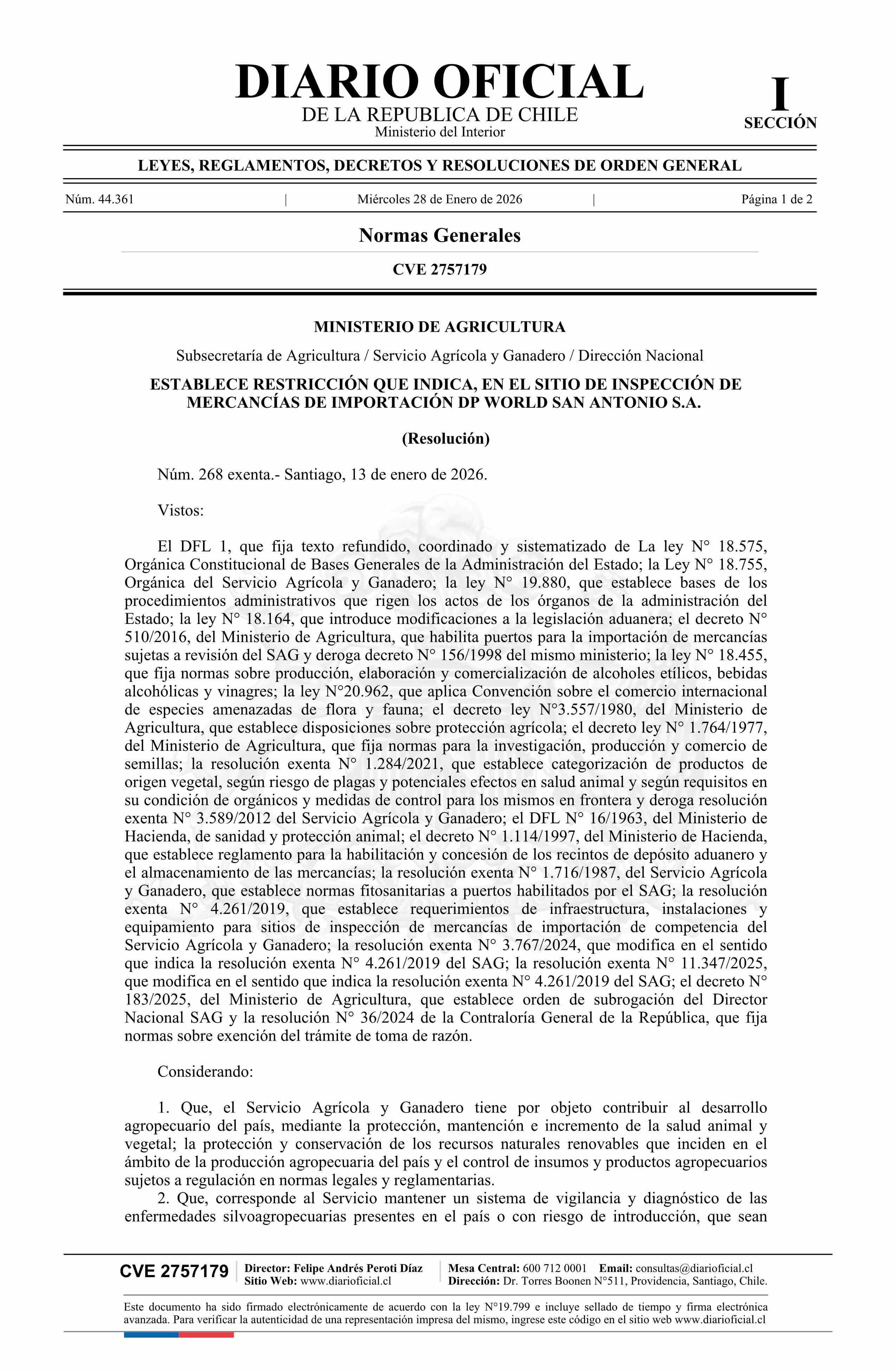 | Título: | Resolución exenta número 268, de 2026.- Establece restricción que indica, en el sitio de inspección de mercancías de importación DP World San Antonio S.A. |