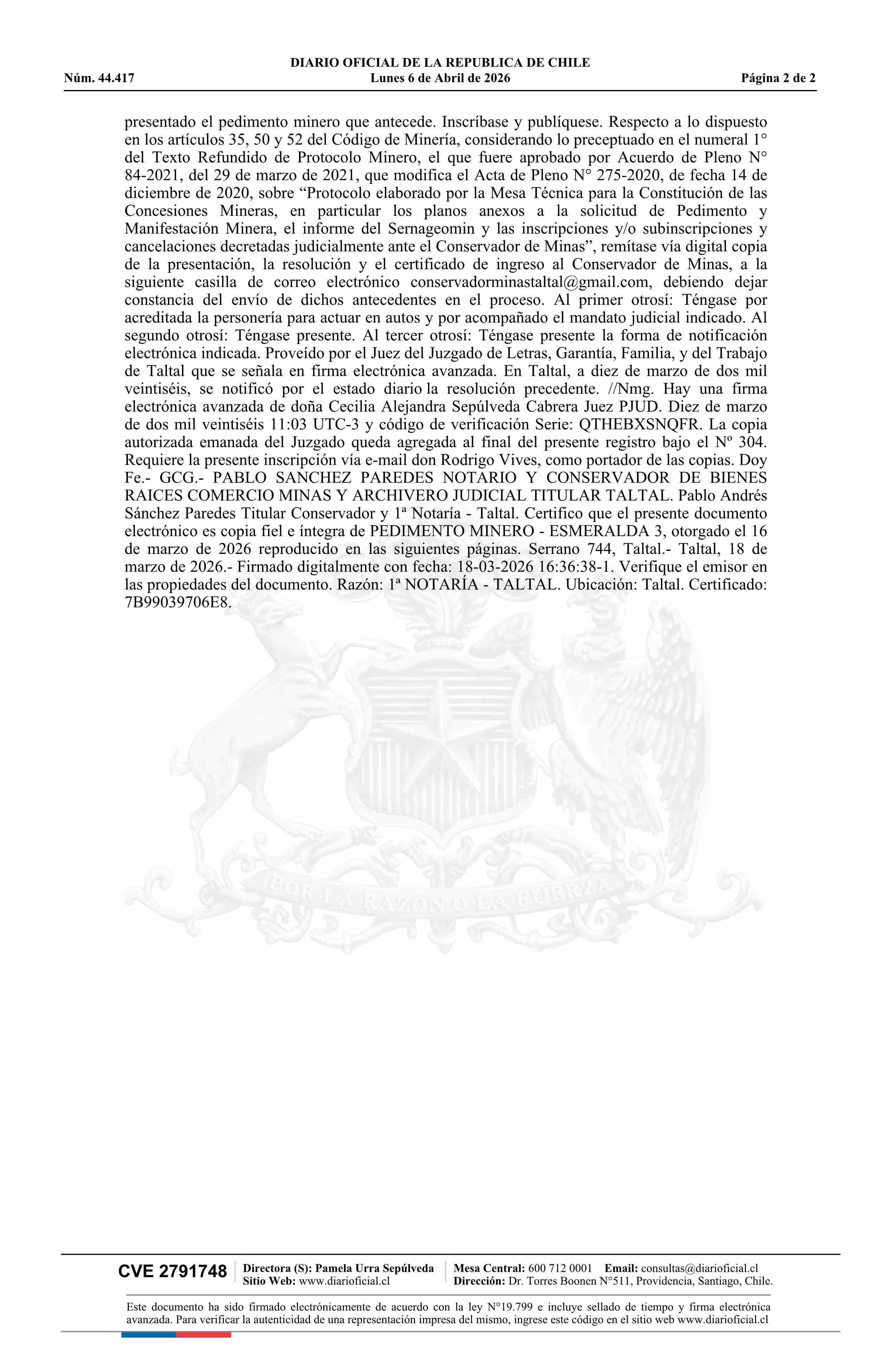 ESMERALDA 3 / Gold Fields Pedernales Limitada