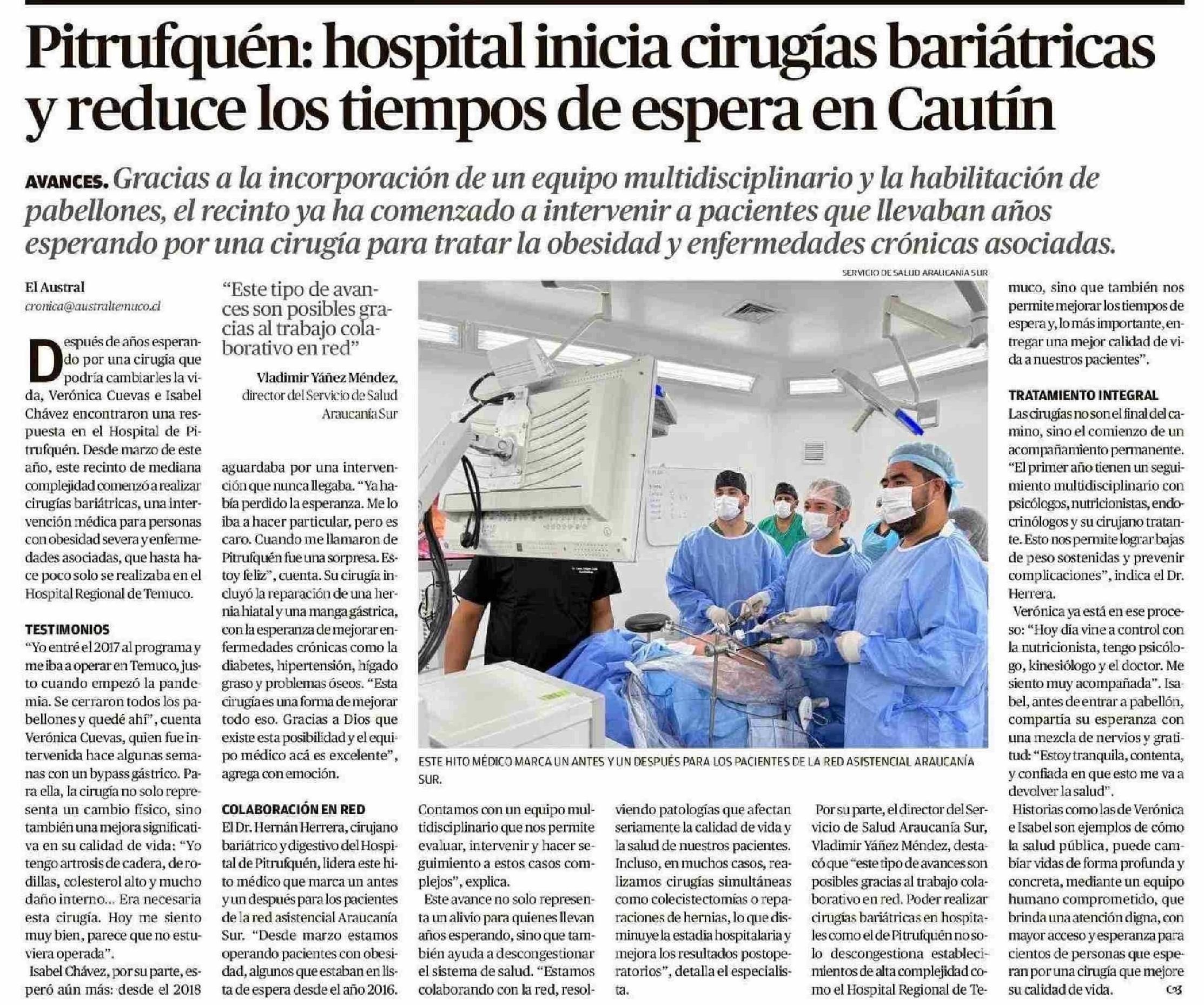 Pitrufquén: hospital inicia cirugías bariátricas y reduce los tiempos de espera en Cautín
