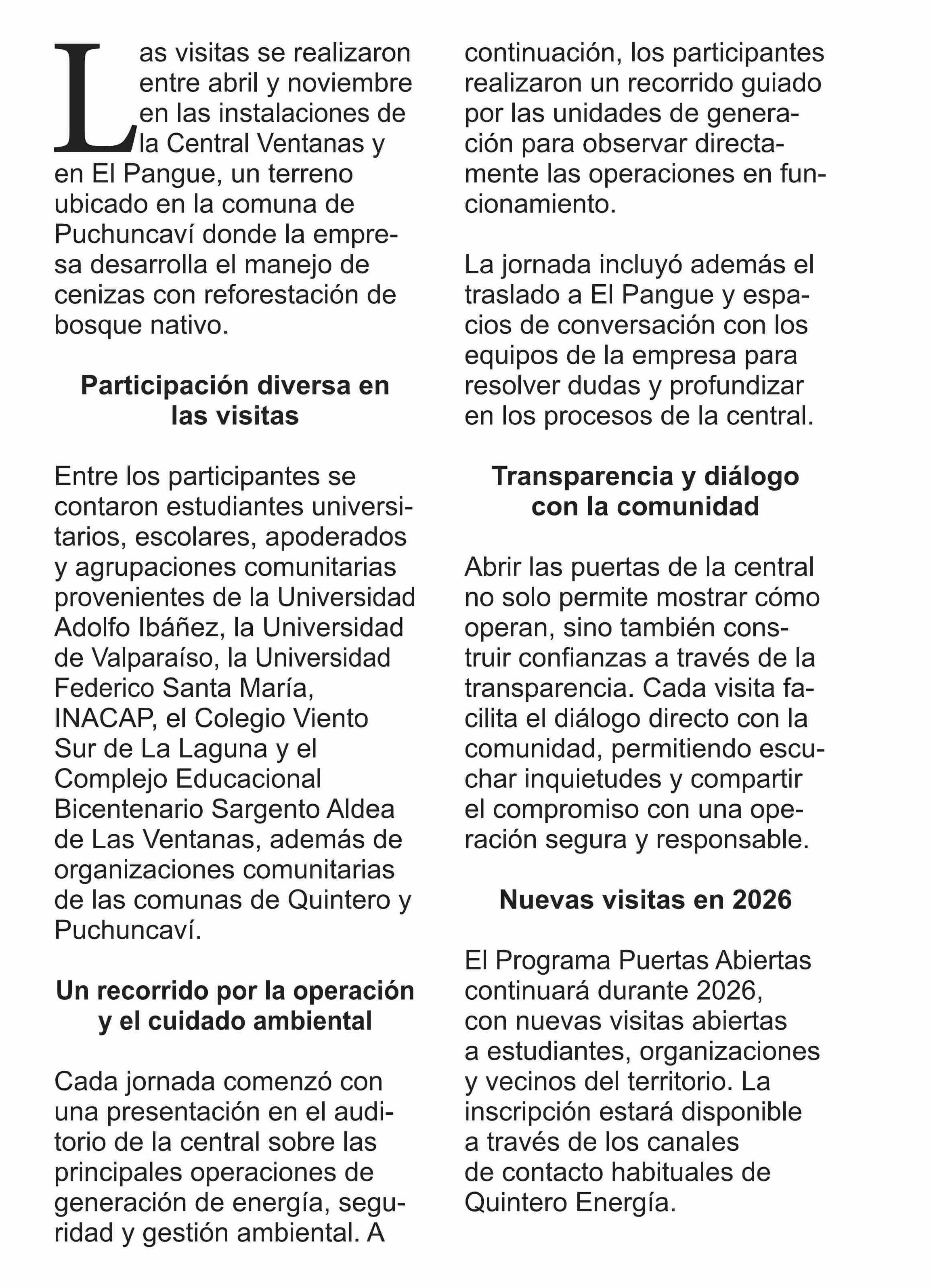 | Título: | Programa Puertas Abiertas acercó a 156 personas a las operaciones de Central Ventanas durante 2025 |