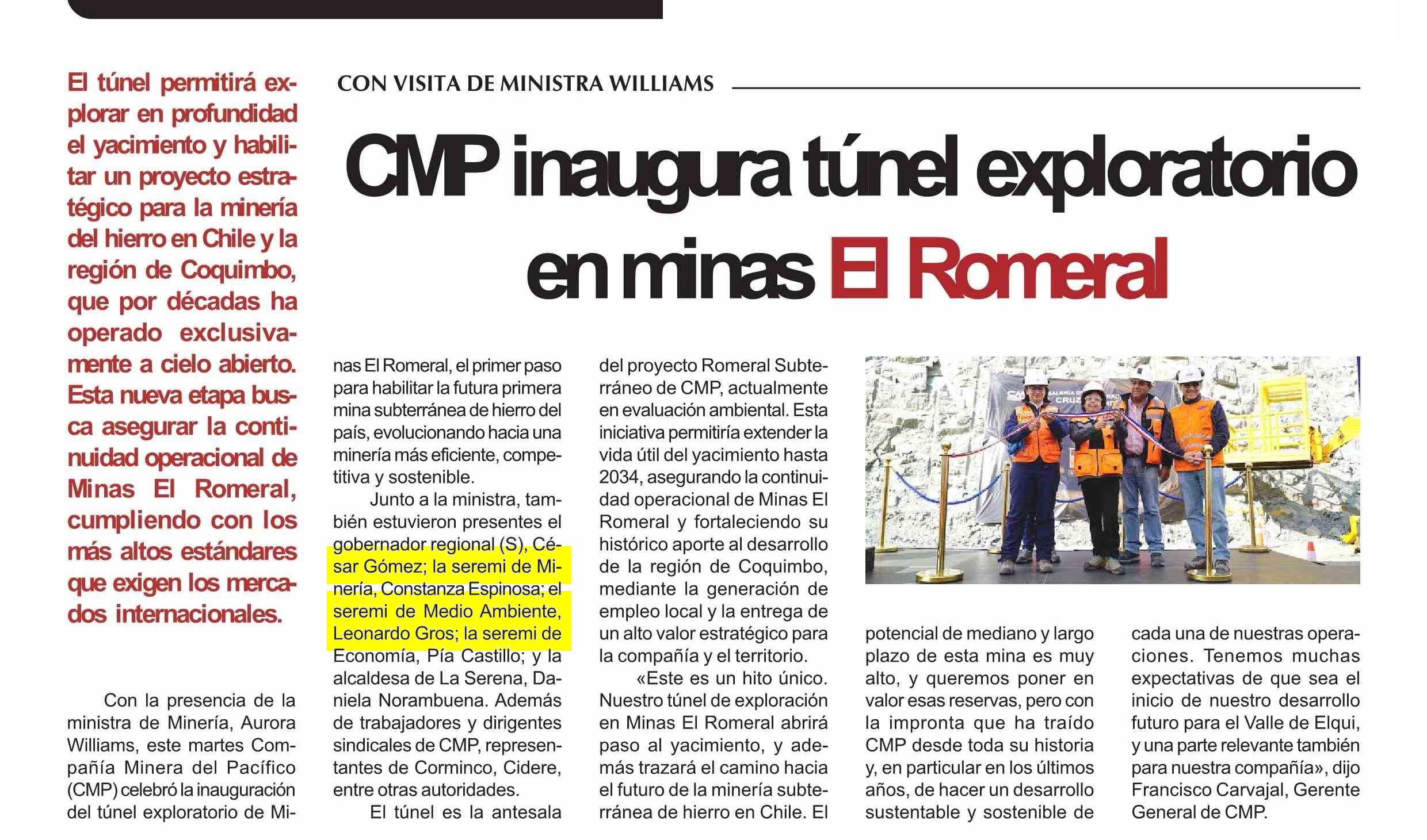 CWP ¡inaugura túnel exploratorio en minas Bl Romeral