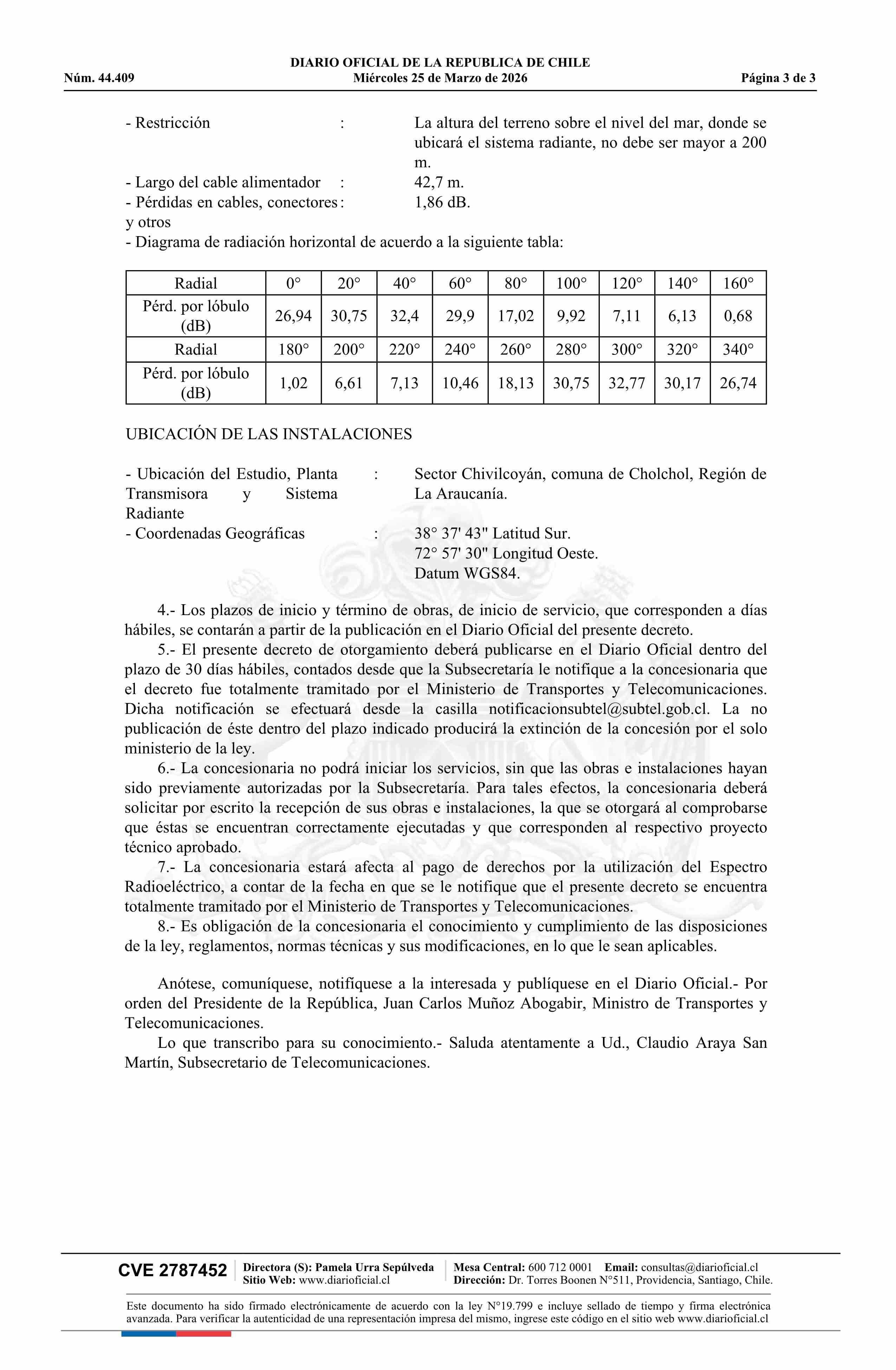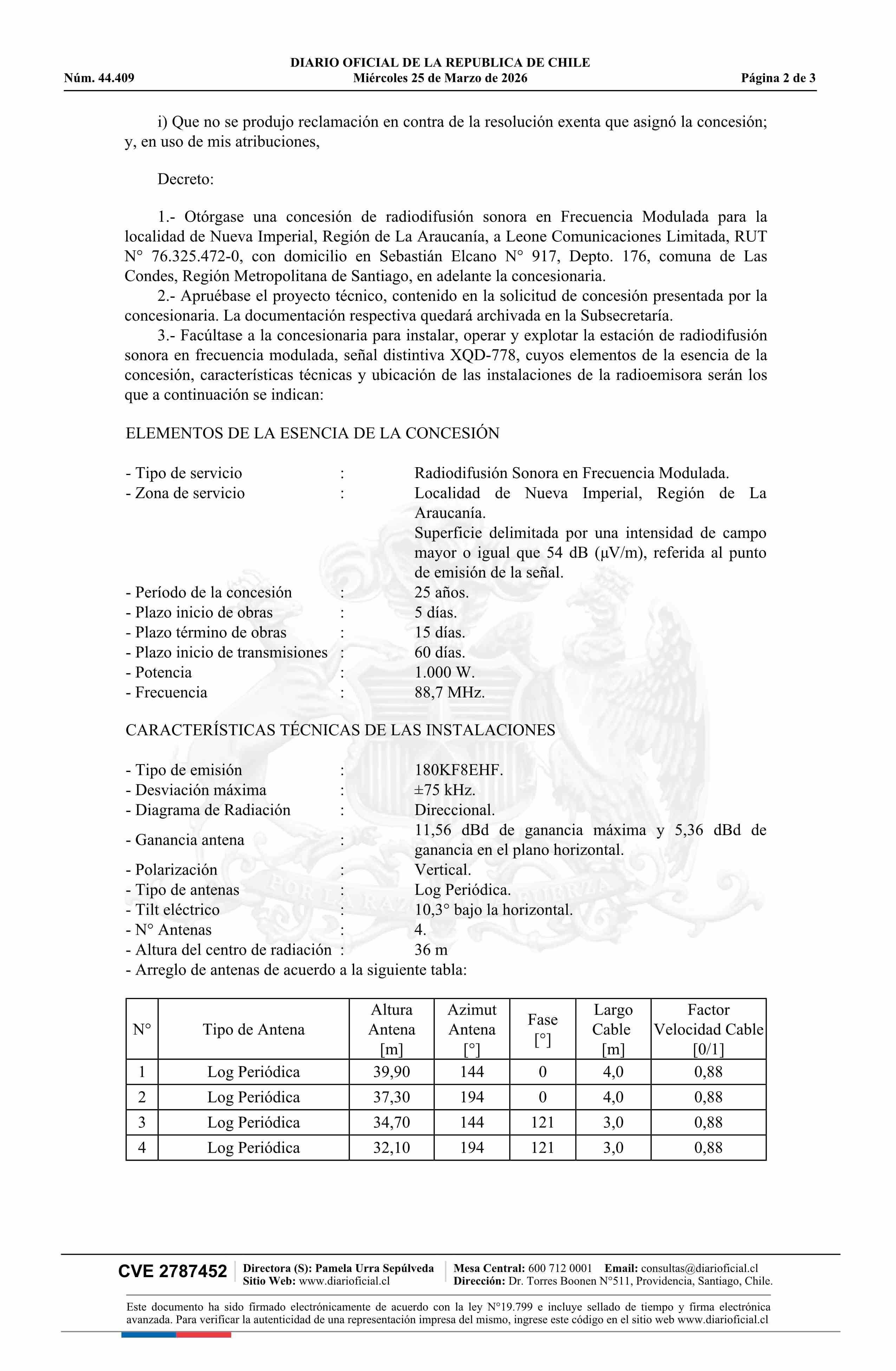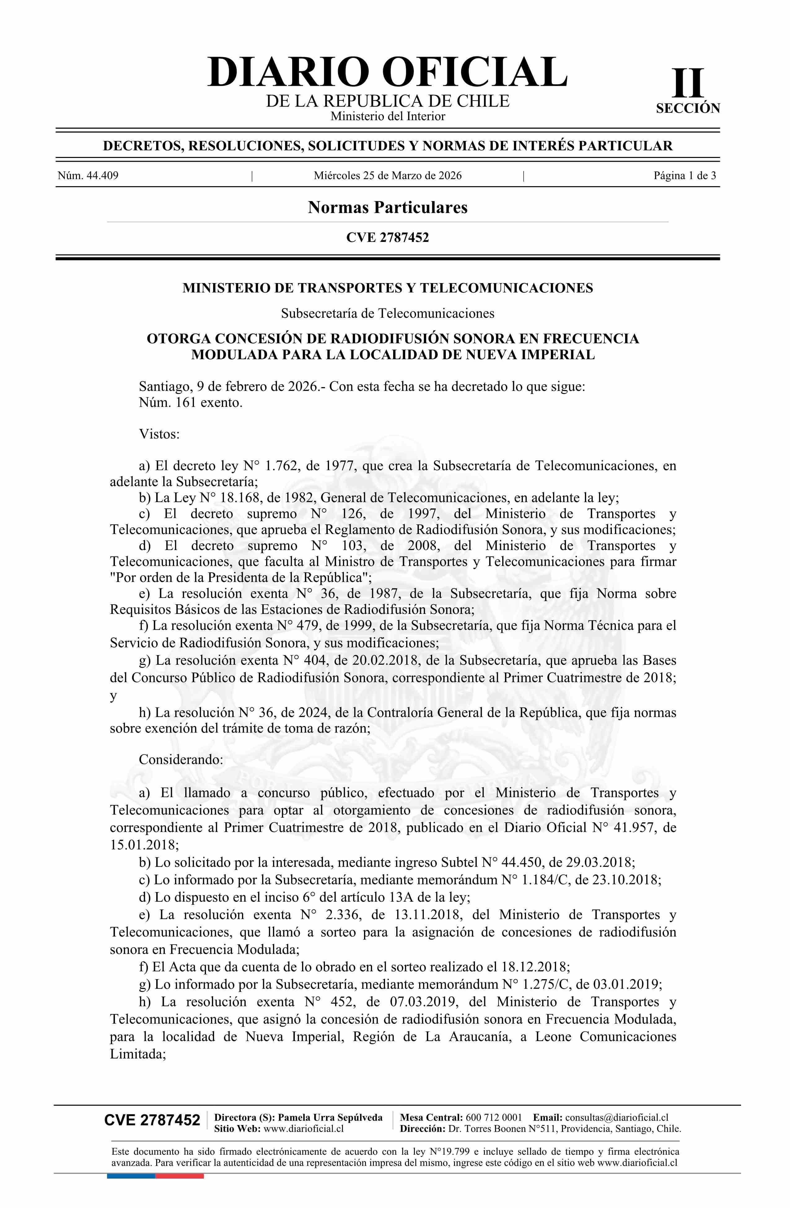 | Título: | Decreto exento número 161, de 2026.- Otorga concesión de radiodifusión sonora en frecuencia modulada para la localidad de Nueva Imperial |