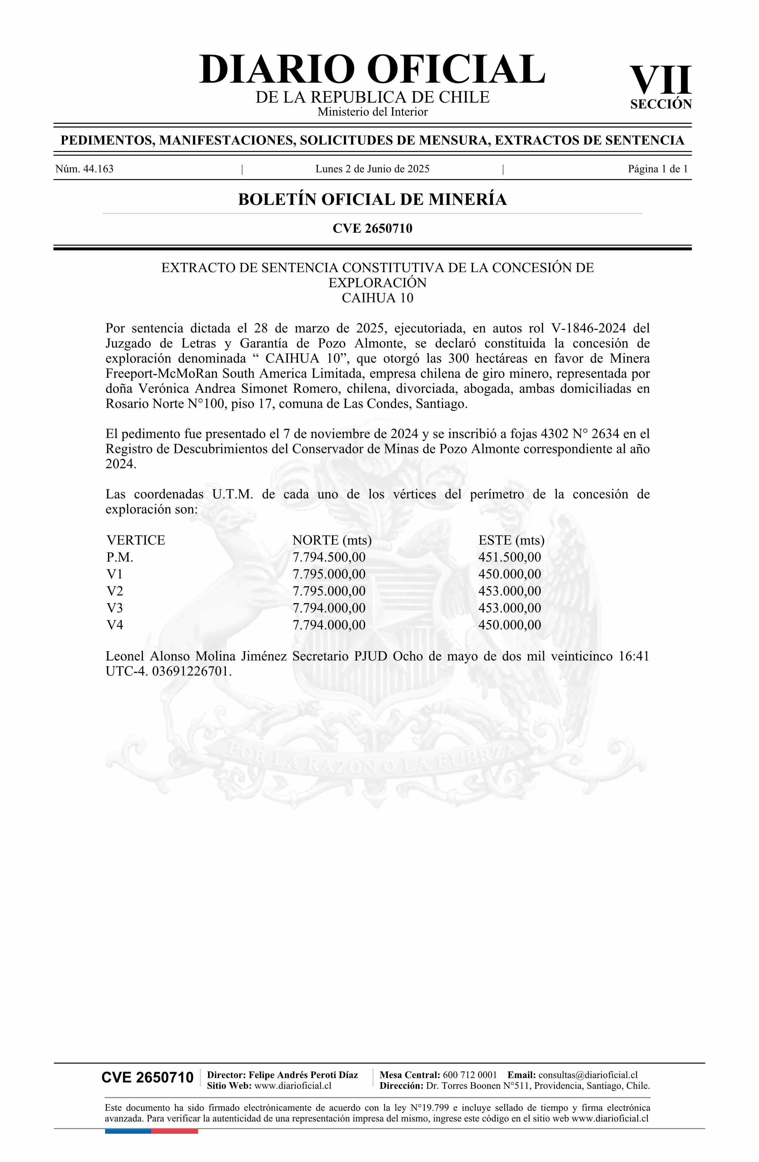 CAIHUA 10 / Minera Freeport-McMoRan South America Limitada