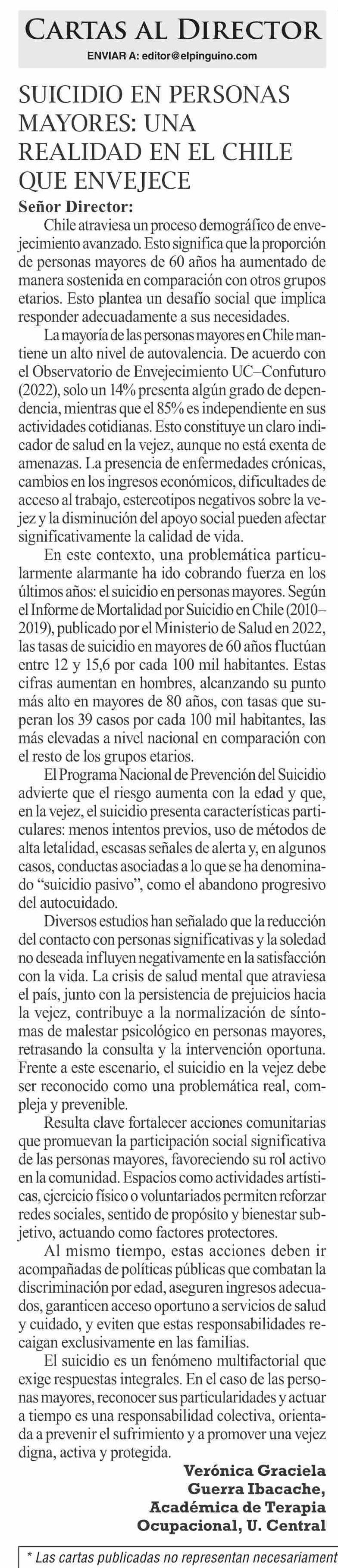 Cartas: SUICIDIO EN PERSONAS MAYORES: UNA REALIDAD EN EL CHILE QUE ENVEJECE