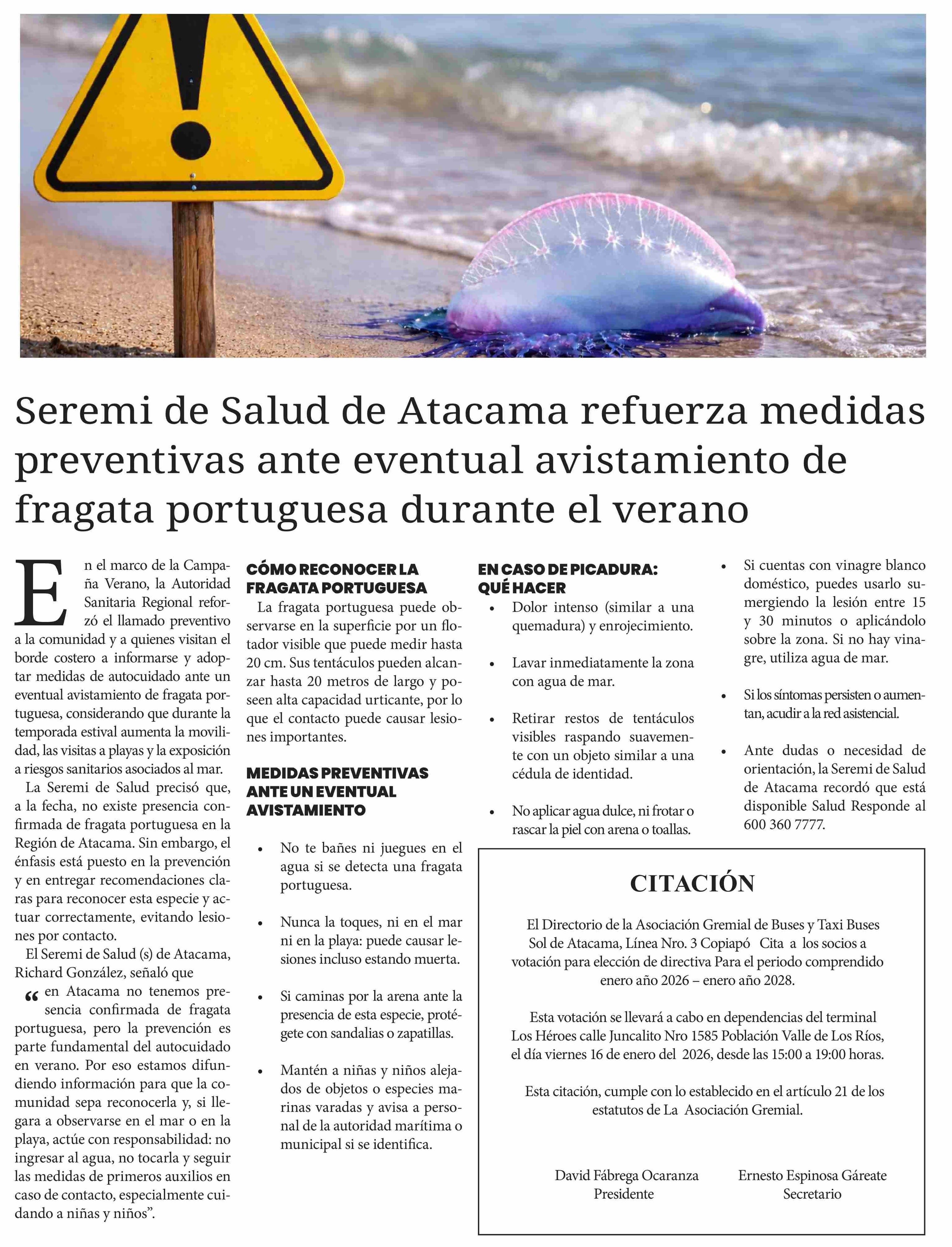 Seremi de Salud de Atacama refuerza medidas preventivas ante eventual avistamiento de fragata portuguesa durante el verano