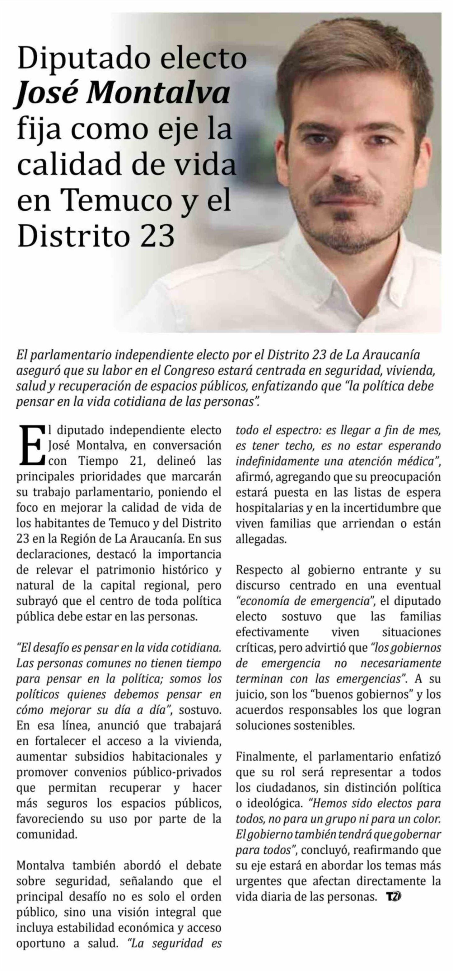 Diputado electo José Montalva fija como eje la calidad de vida en Temuco y el Distrito 23