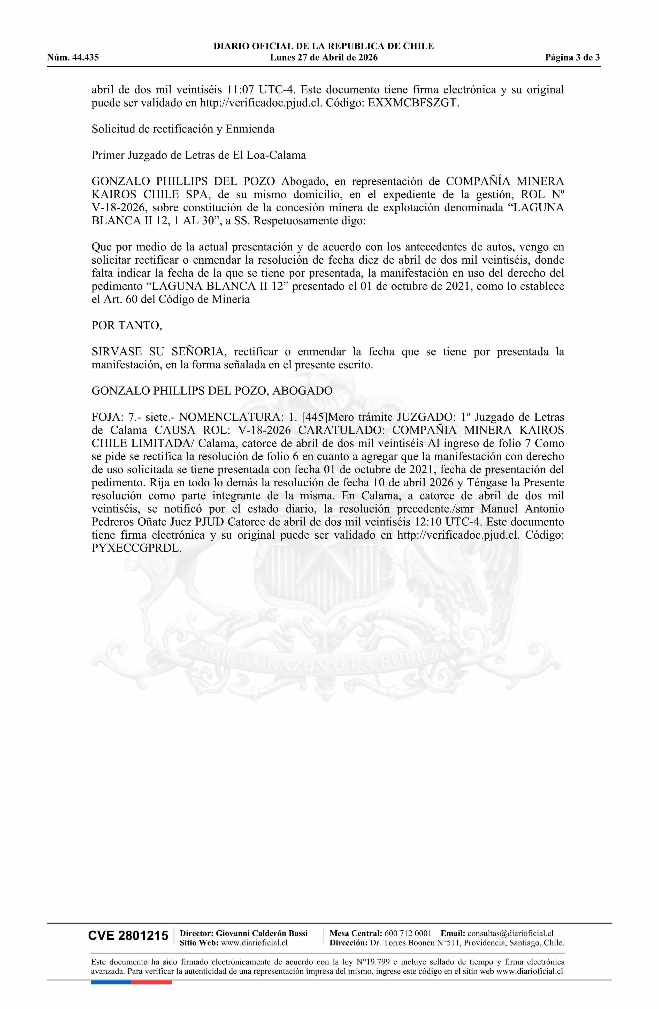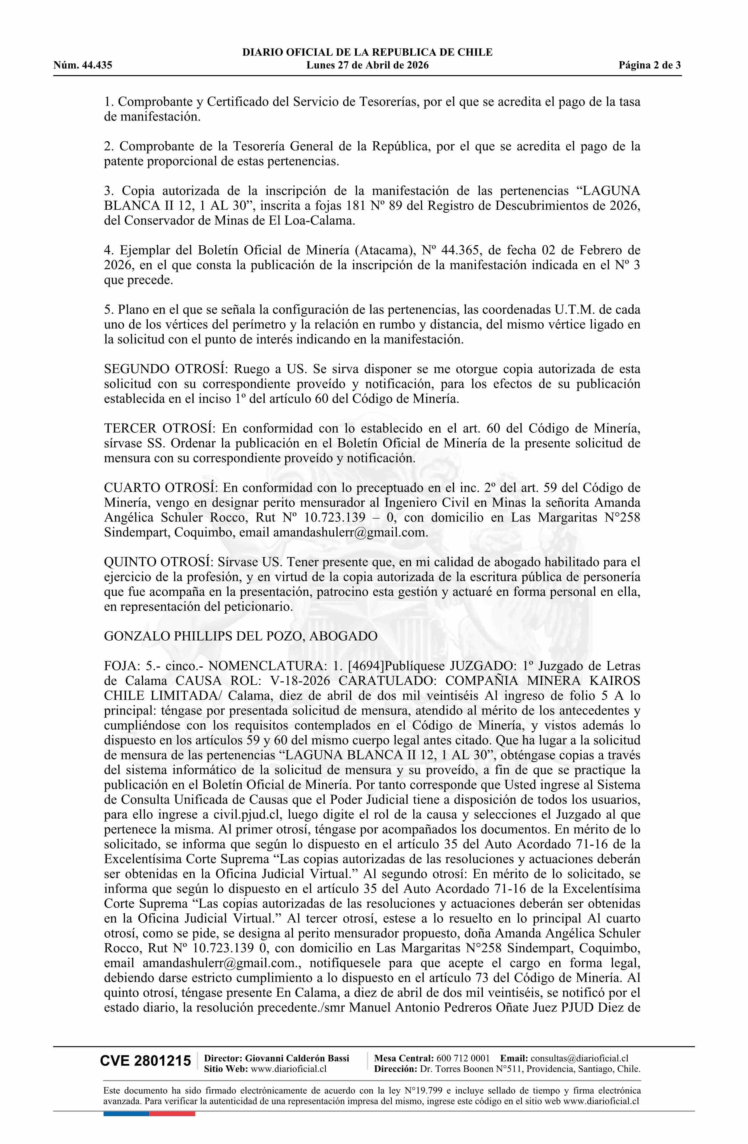 | Título: | LAGUNA BLANCA II 12, 1 AL 30 / Compañía Minera Kairos Chile Limitada |