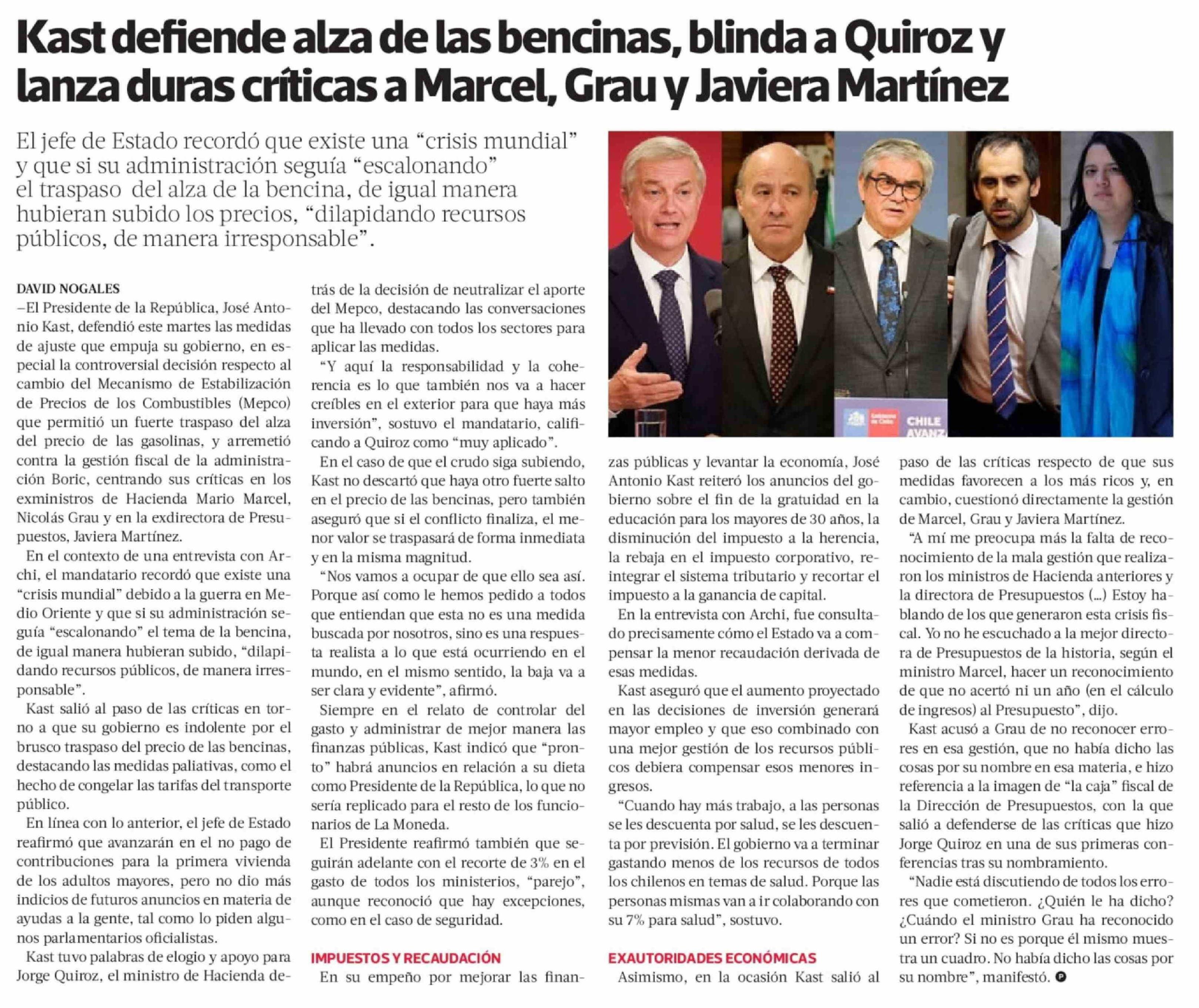 Kast defiende alza de las bencinas, blinda a Quiroz y lanza duras críticas a Marcel, Grau y Javiera Martínez