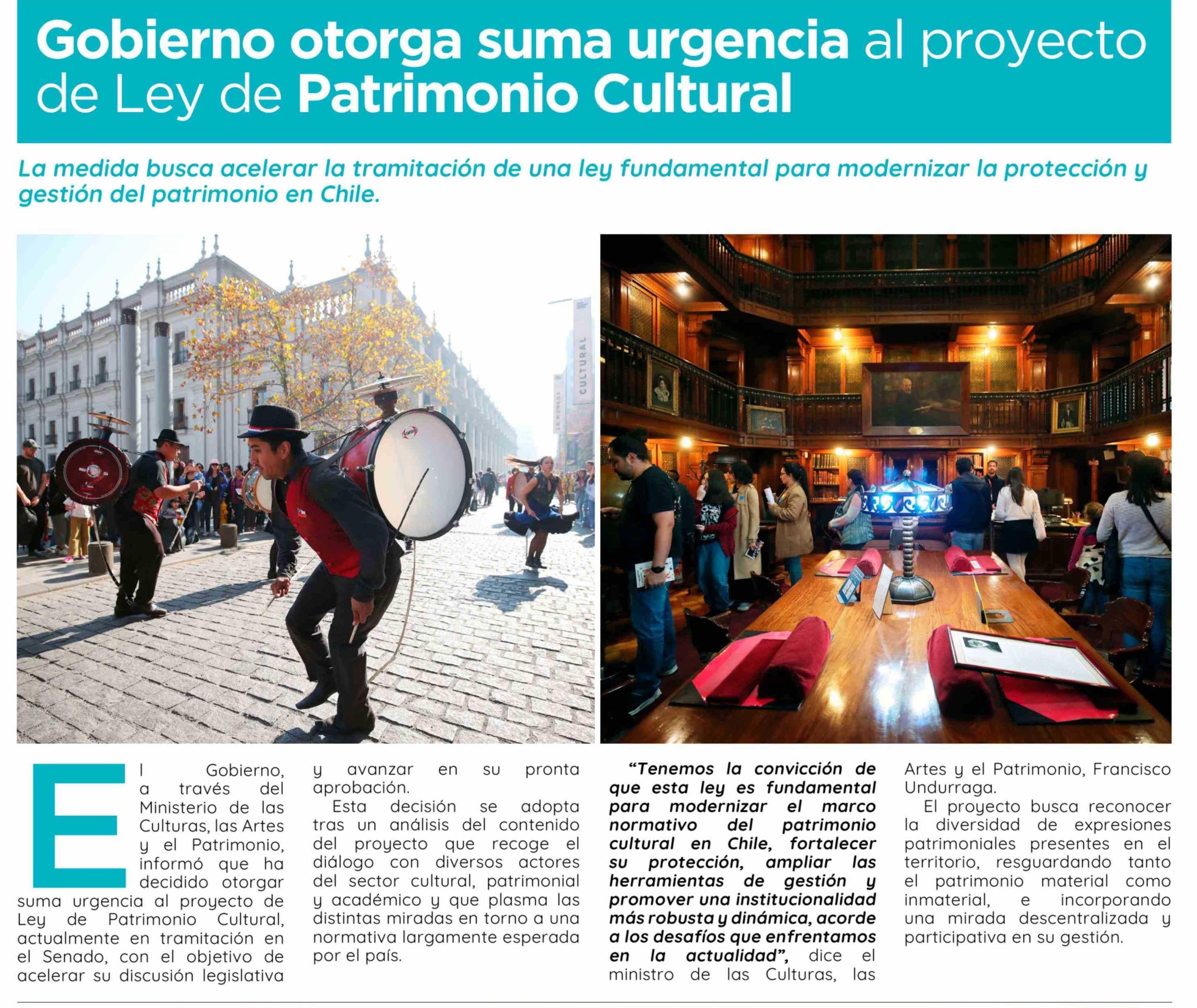 Gobierno otorga suma urgencia al proyecto de Ley de Patrimonio Cultural