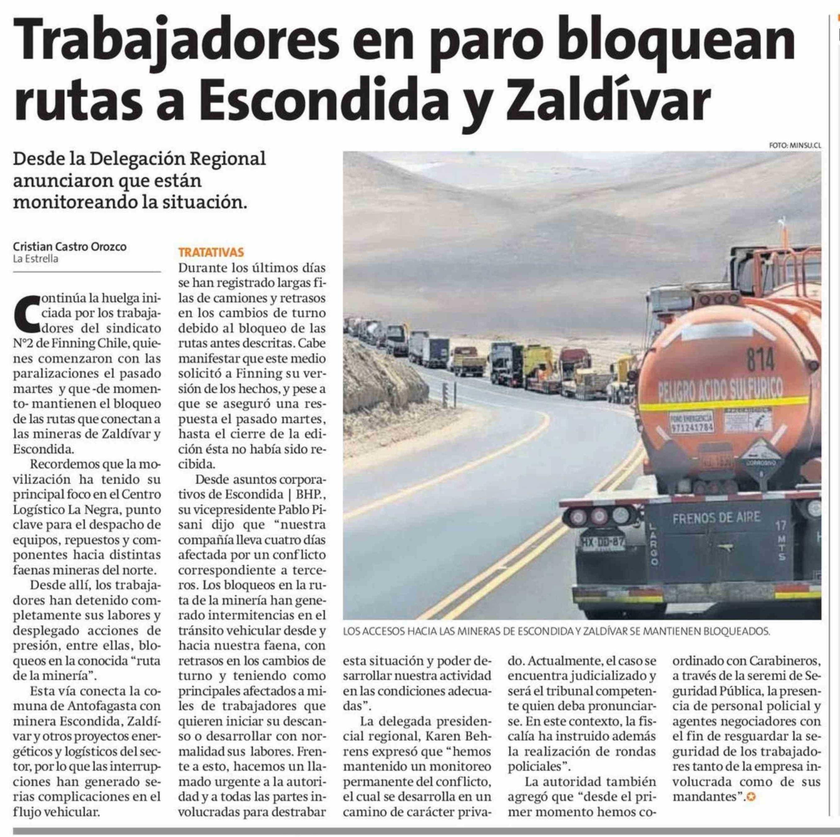 Trabajadores en paro bloquean rutas a Escondida y Zaldívar