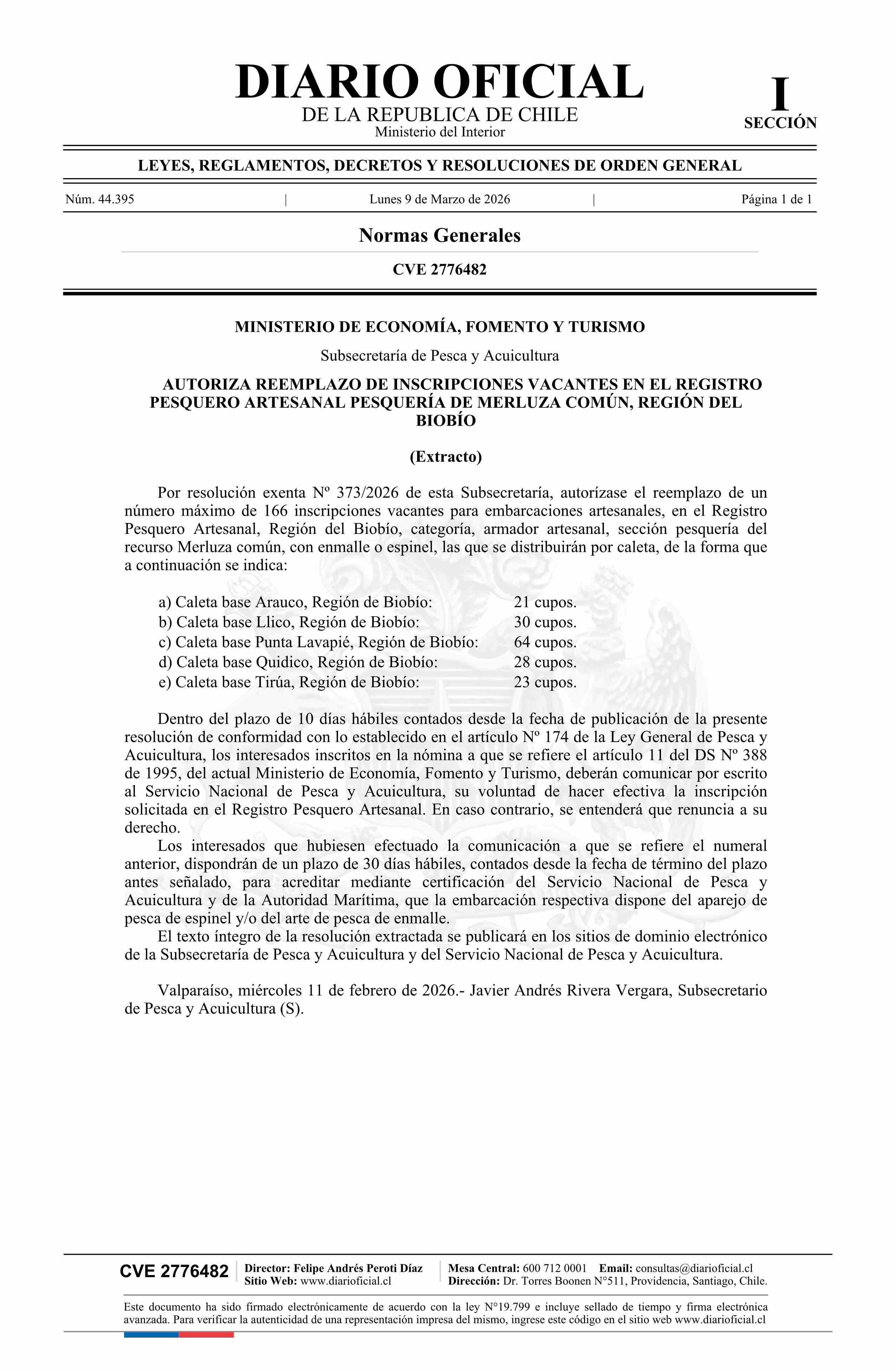 | Título: | Extracto de resolución exenta número 373, de 2026.- Autoriza reemplazo de inscripciones vacantes en el Registro Pesquero Artesanal, pesquería de Merluza común, Región del Biobío |