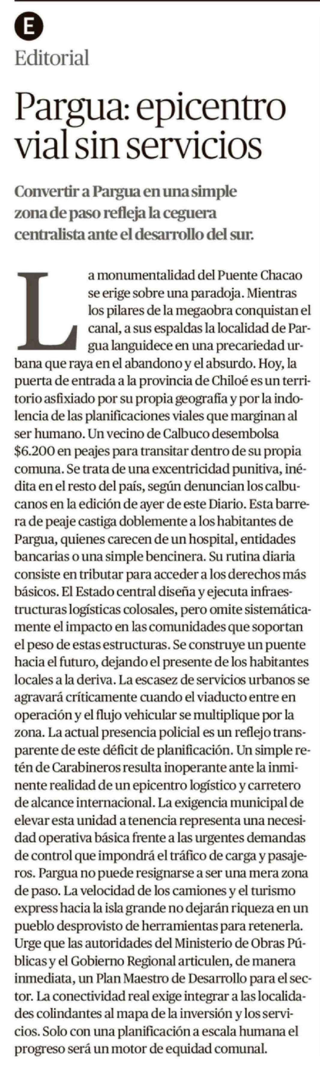 Editorial: Pargua: epicentro vial sin servicios
