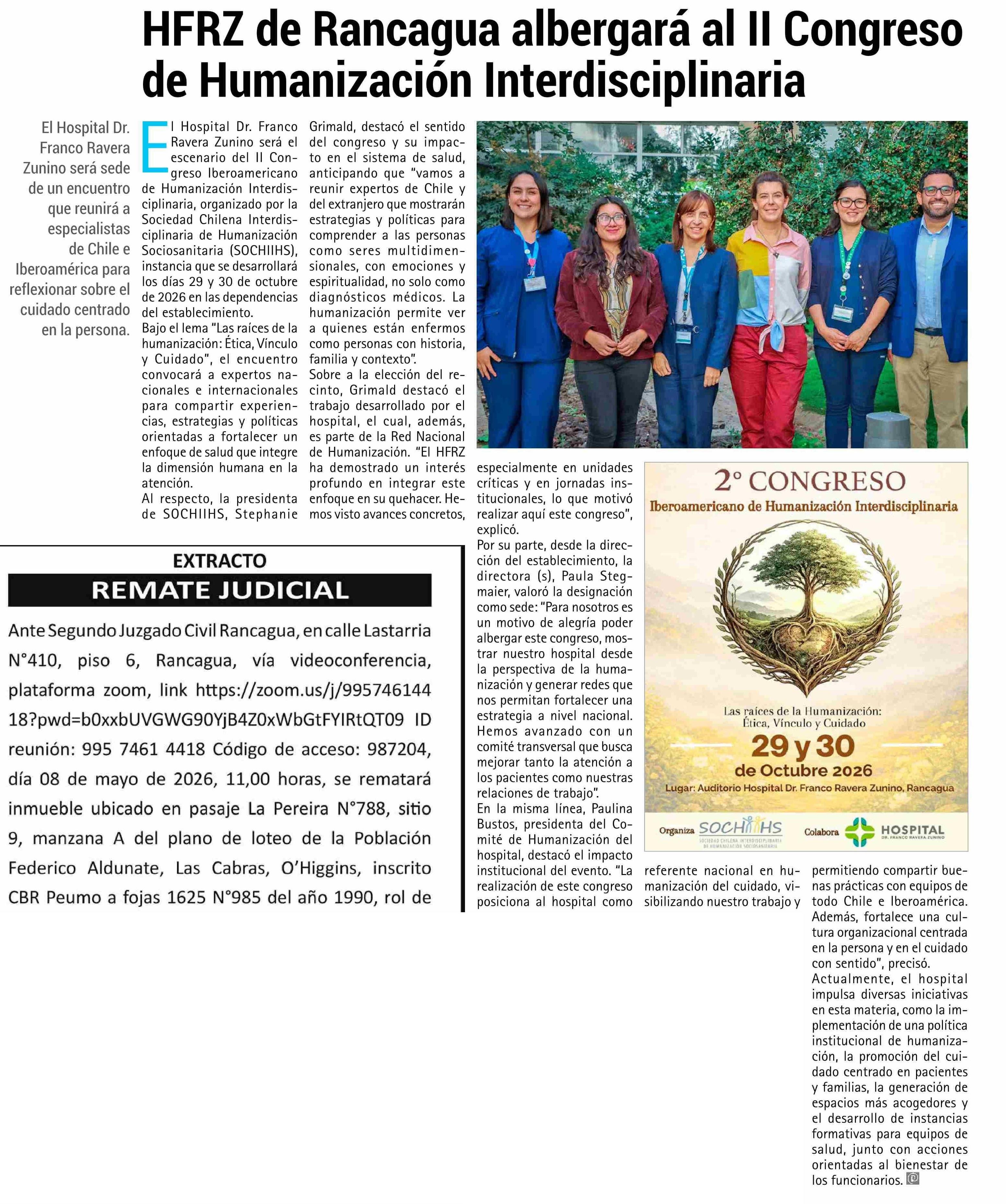 HFRZ de Rancagua albergará al II Congreso de Humanización Interdisciplinaria