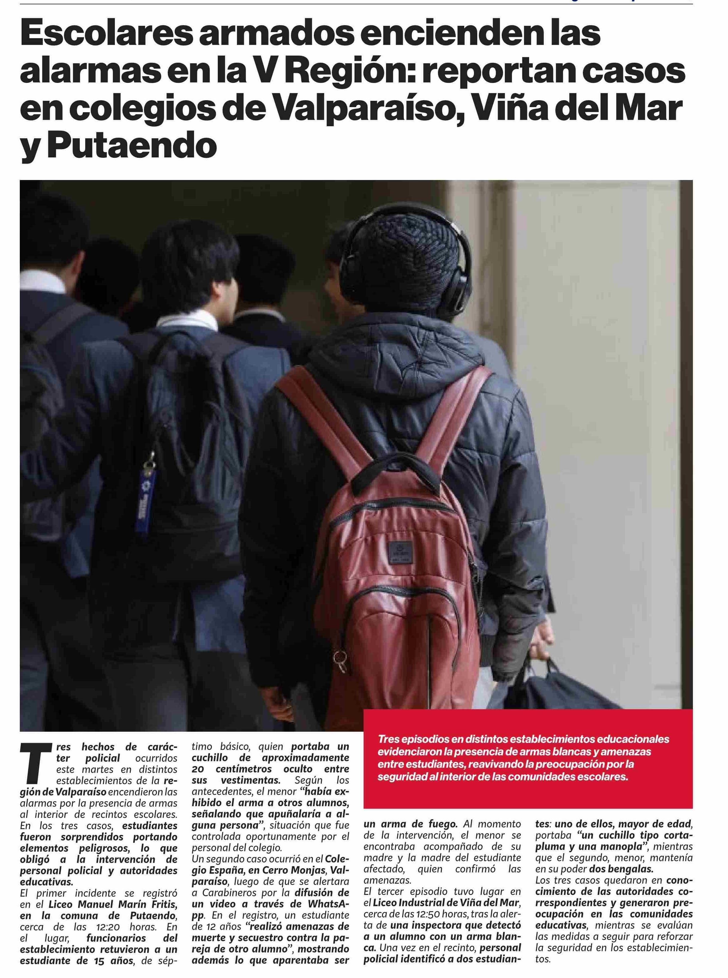 Escolares armados encienden las alarmas en la V Región: reportan casos en colegios de Valparaíso, Viña del Mar y Putaendo