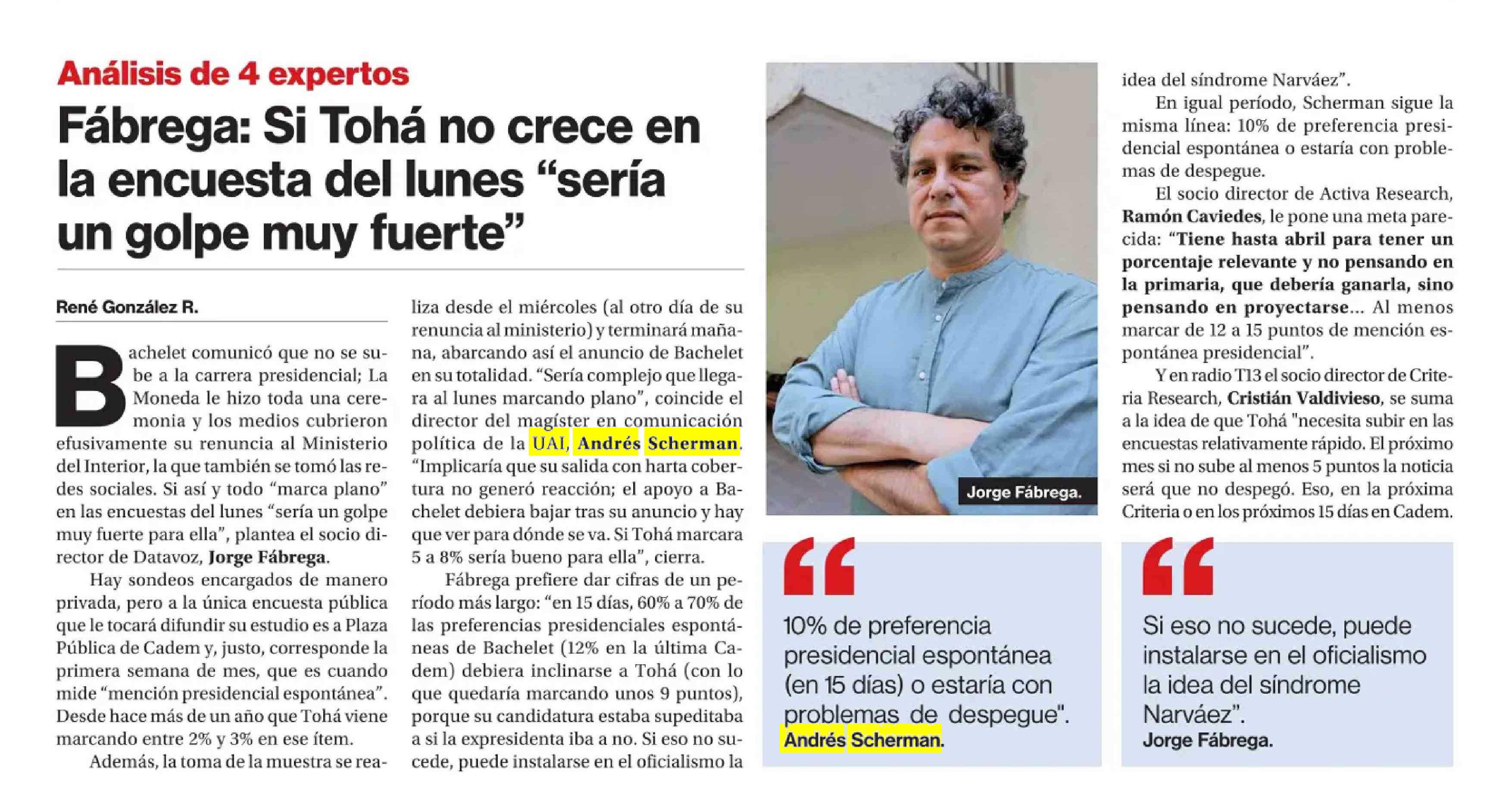 Fábrega: Si Tohá no crece en la encuesta del lunes "sería un golpe muy fuerte"