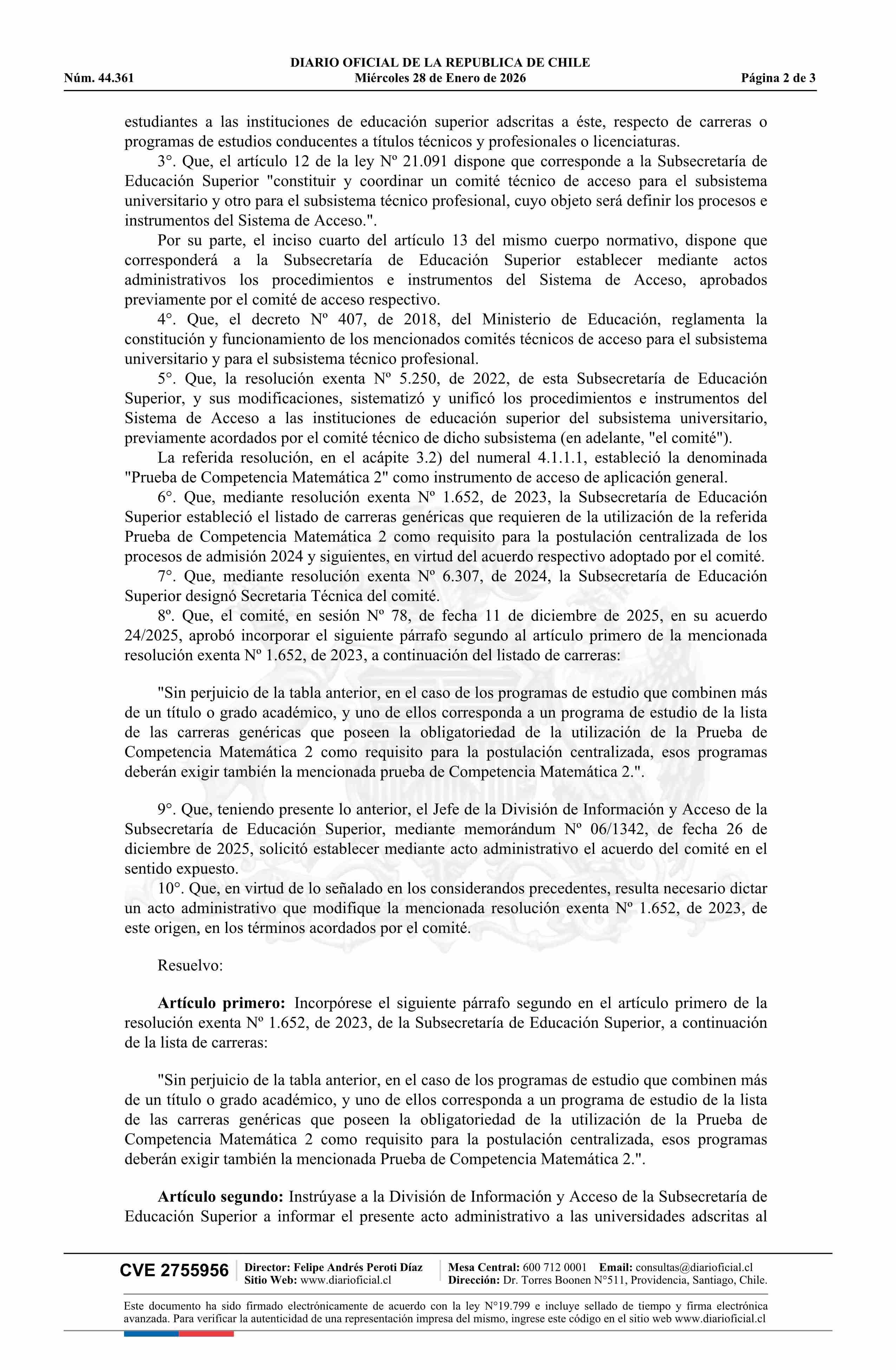 | Título: | Resolución exenta número 94, de 2026.- Modifica resolución número 1.652 exenta, de 2023, que estableció obligatoriedad de utilización de la prueba de acceso a la educación superior de Competencia Matemática 2, para el proceso de admisión 2024 y siguientes, para las carreras que indica, determinadas |