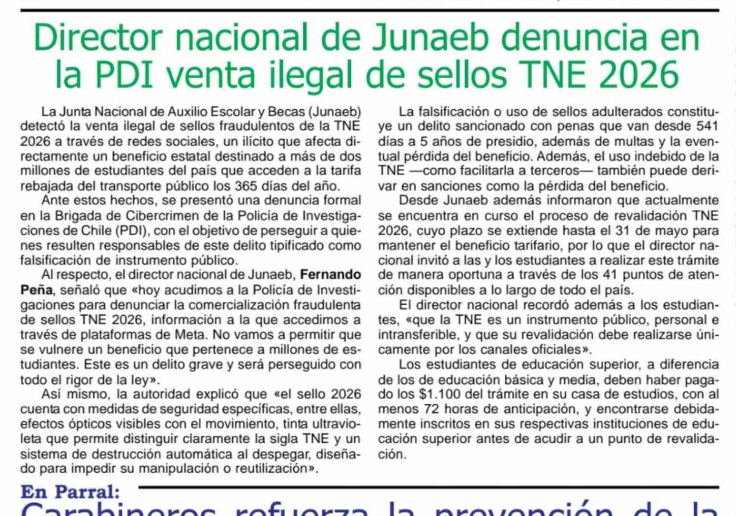 Director nacional de Junaeb denuncia en la PDI venta ilegal de sellos TNE 2026