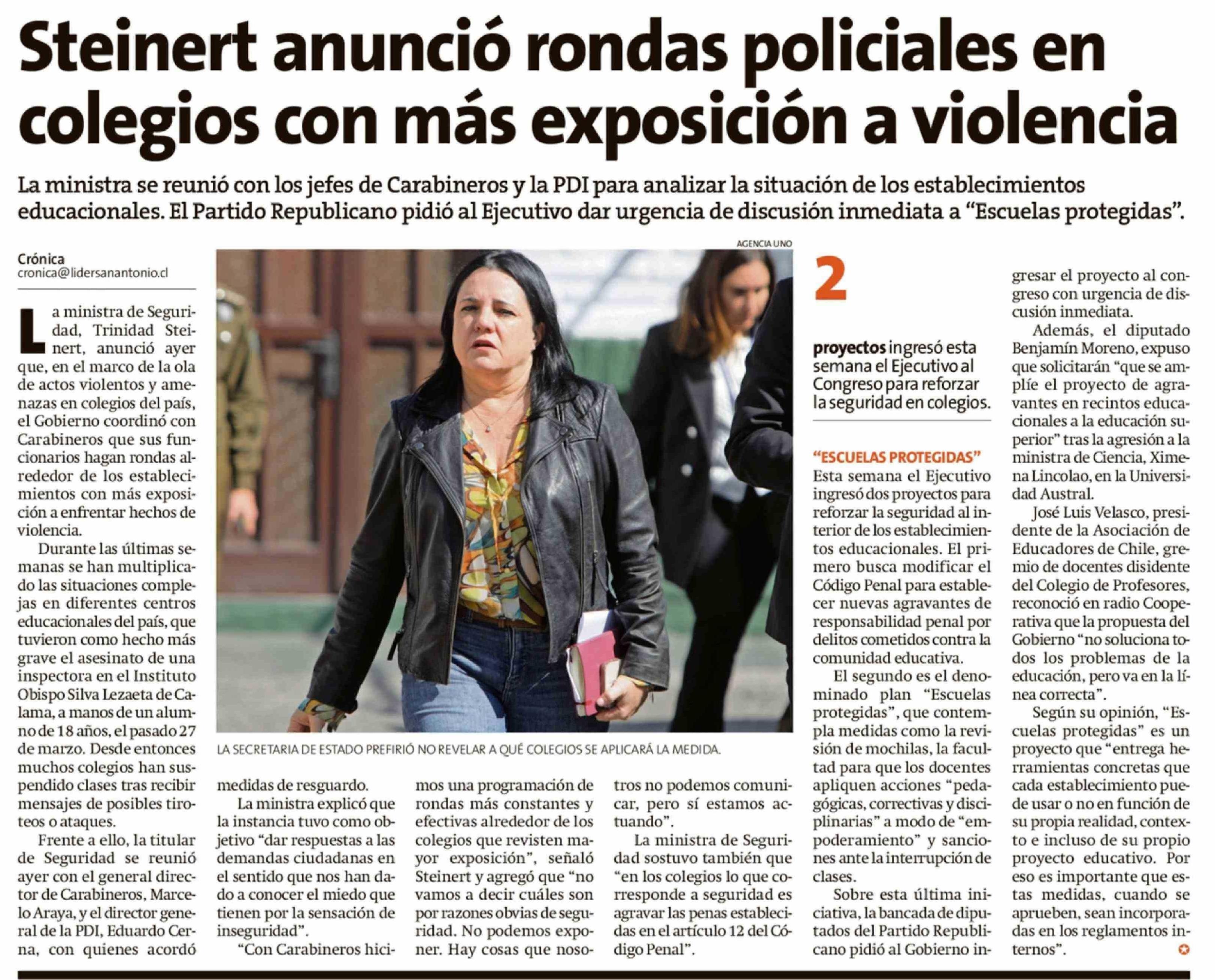 Título: Steinert anunció rondas policiales en colegios con más exposición a violencia