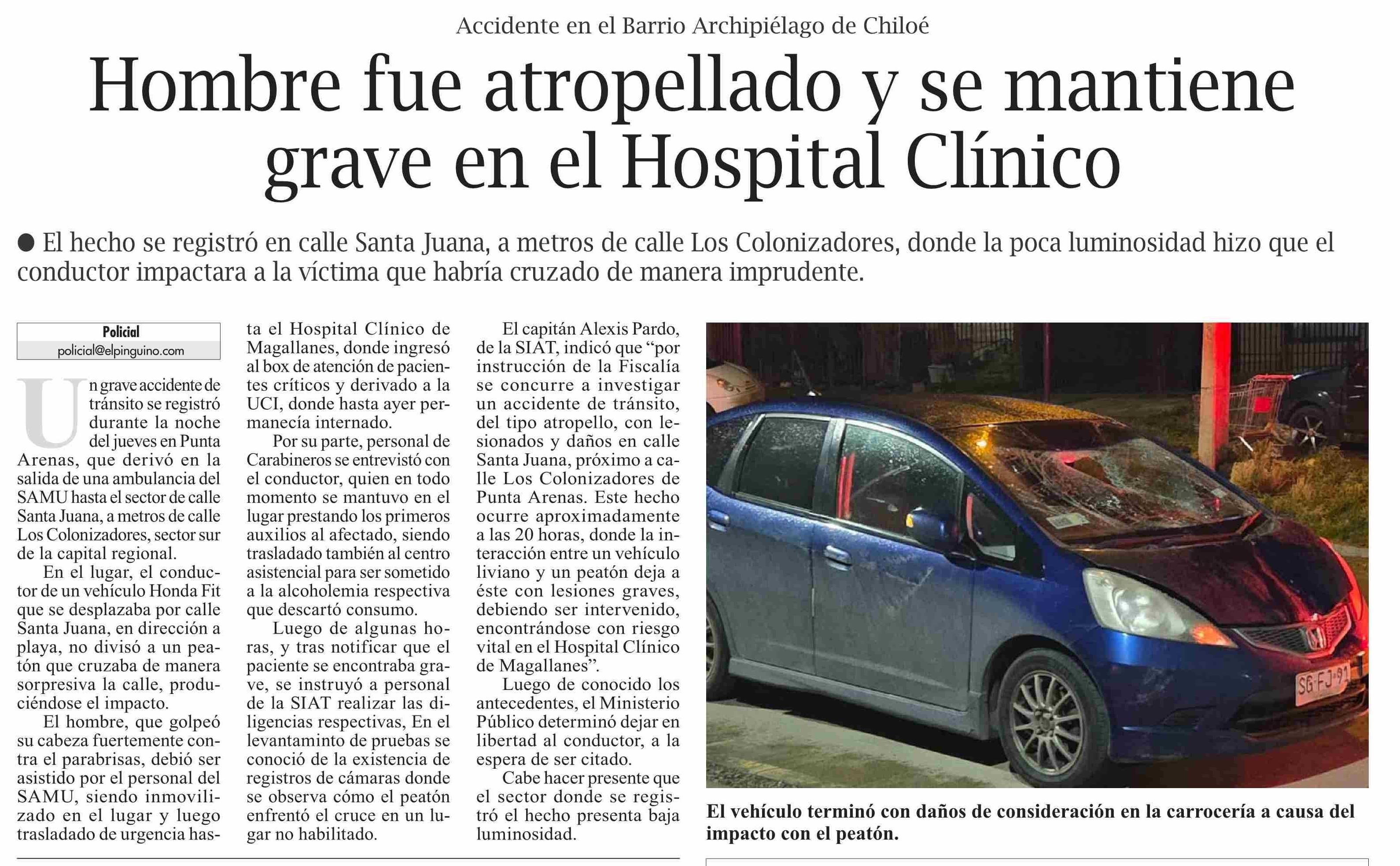 Hombre fue atropellado y se mantiene grave en el Hospital Clínico