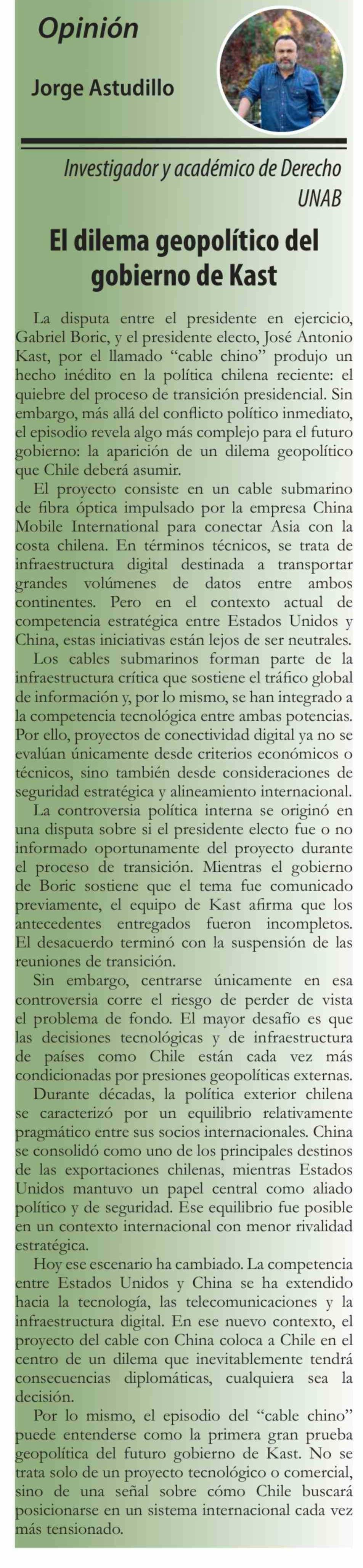Título: Columnas de Opinión: El dilema geopolítico del gobierno de Kast