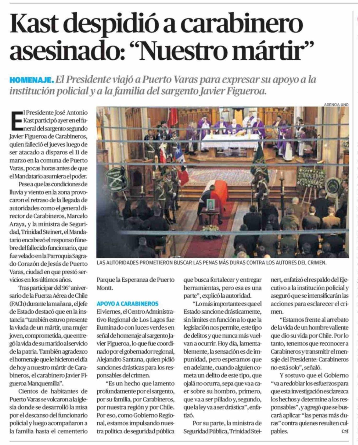 Kast despidió a carabinero asesinado: "Nuestro mártir"