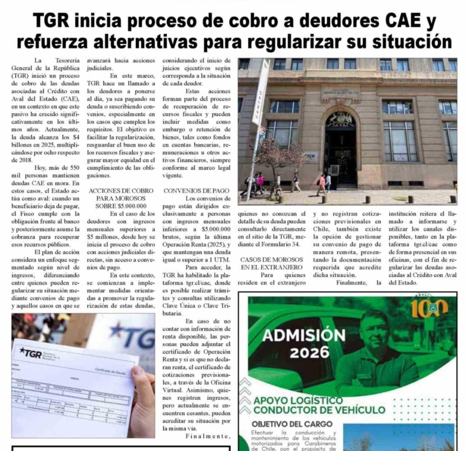 TGR inicia proceso de cobro a deudores CAE y refuerza alternativas para regularizar su situación