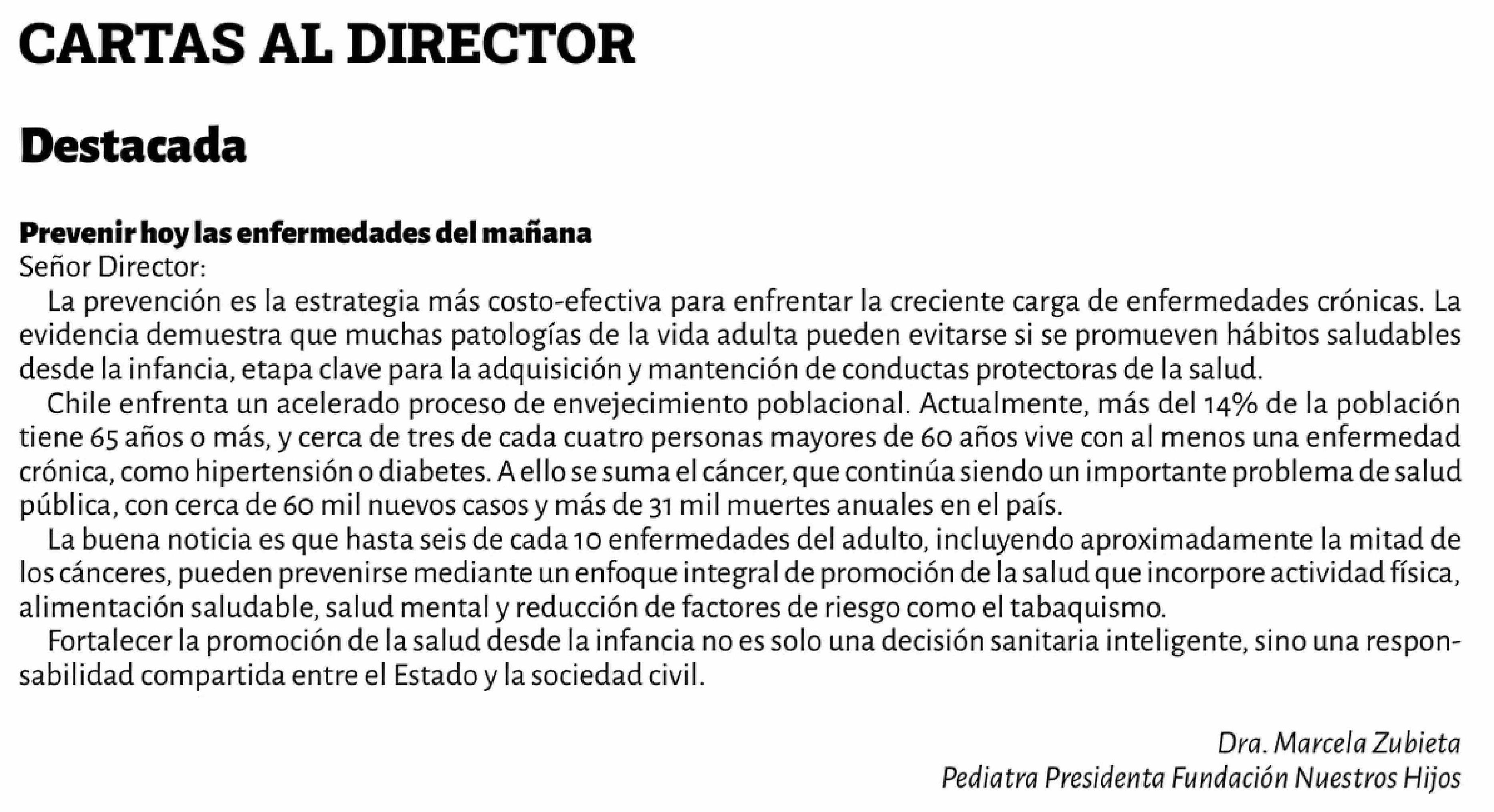 Título: Cartas: Prevenir hoy las enfermedades del mañana Señor Director: La prevención es la estrategia más costo-efectiva para enfrentar la creciente carga de enfermedades crónicas. La evidencia demuestra que muchas patologías de la vida adulta pueden evitarse si se promueven hábitos saludables desde la in