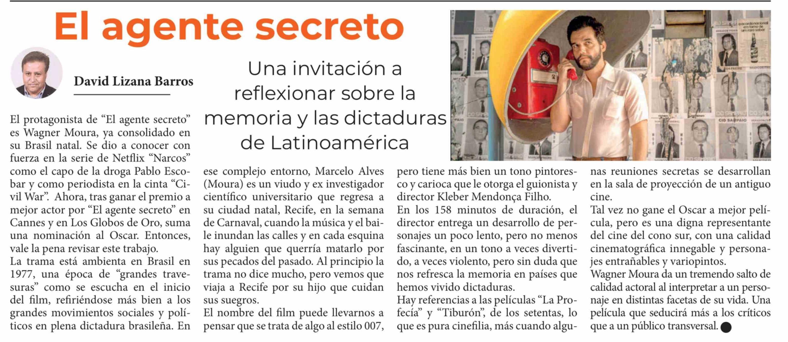 | Título: | Columnas de Opinión: El protagonista de "El agente secreto" es Wagner Moura, ya consolidado en su Brasil natal. Se dio a conocer con fuerza en la serie de Netflix "Narcos" como el capo de la droga Pablo Escobar y como periodista en la cinta "Civil War". Ahora, tras ganar el premio a mejor actor por |