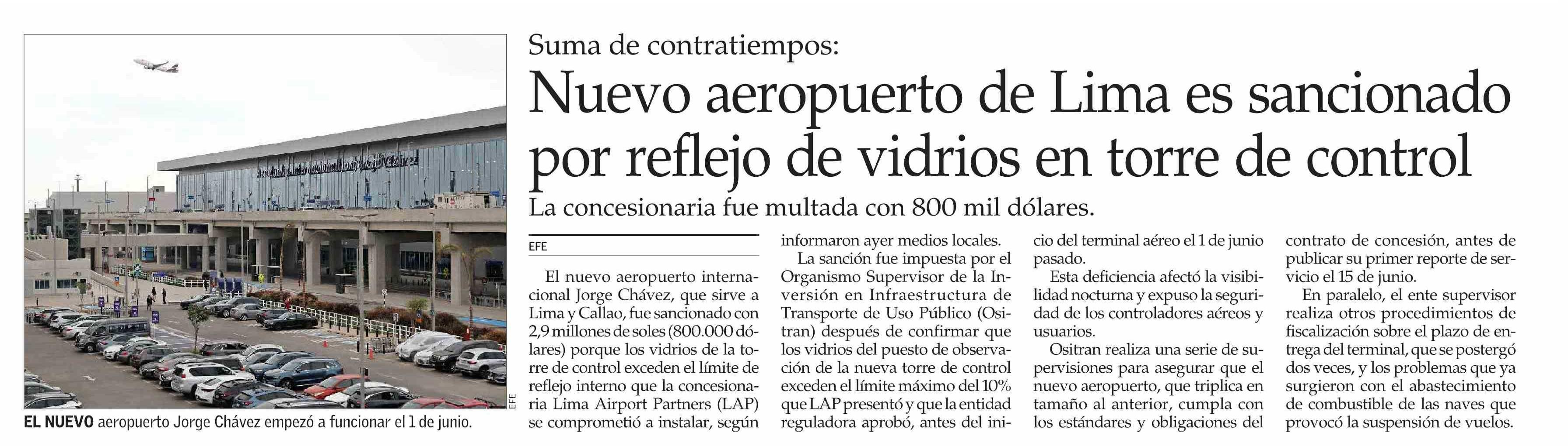 Nuevo aeropuerto de Lima es sancionado por reflejo de vidrios en torre de control