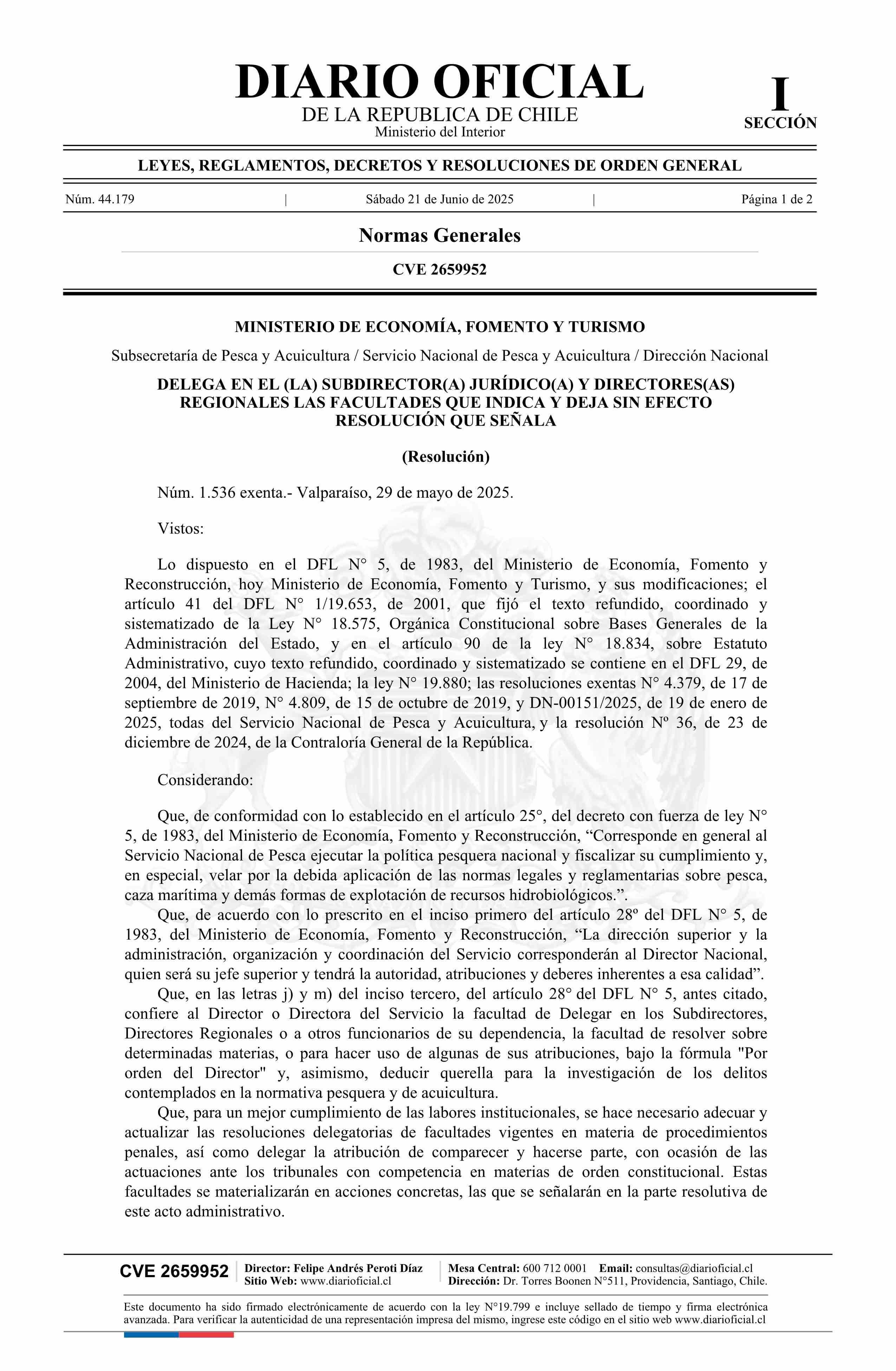 | Título: | Resolución exenta número 1.536, de 2025.- Delega en el (la) Subdirector(a) Jurídico(a) y Directores(as) Regionales las facultades que indica y deja sin efecto resolución que señala |