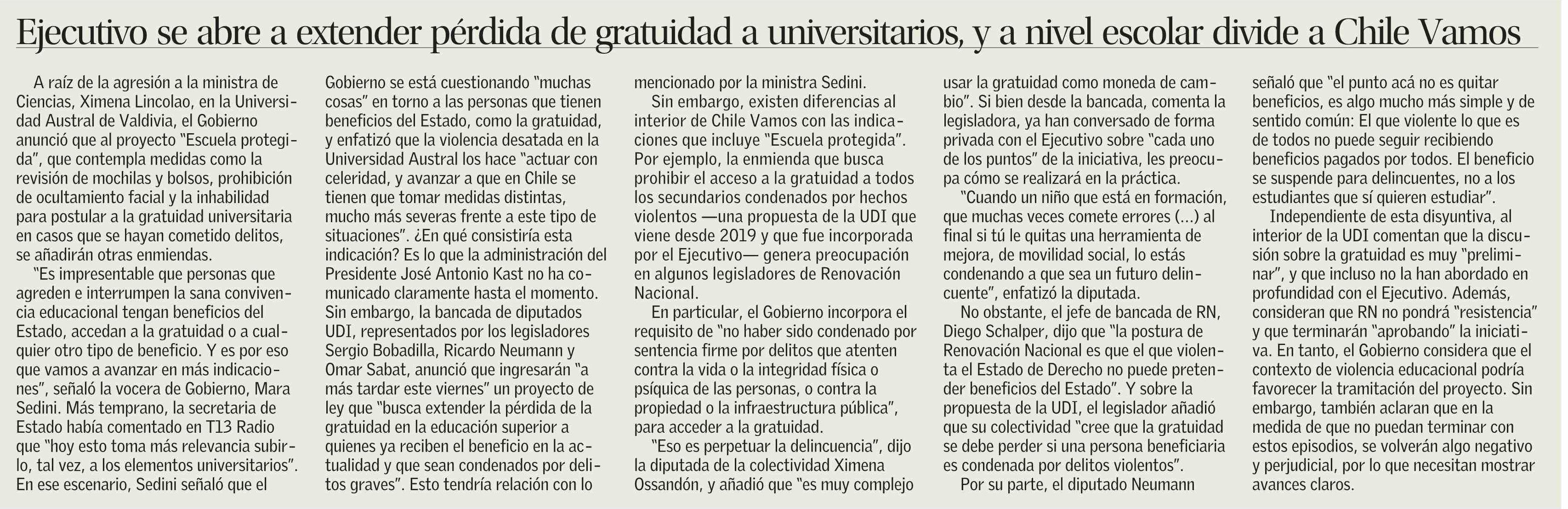 Título: Ejecutivo se abre a extender pérdida de gratuidad a universitarios, y a nivel escolar divide a Chile Vamos