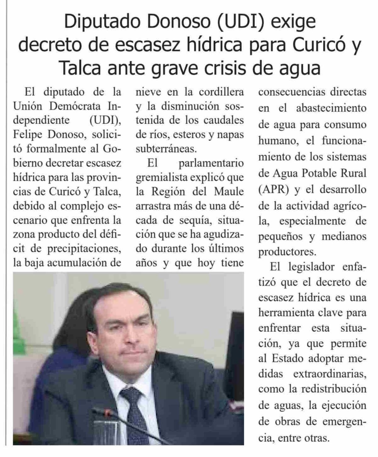 Diputado Donoso (UDI) exige decreto de escasez hídrica para Curicó y Talca ante grave crisis de agua