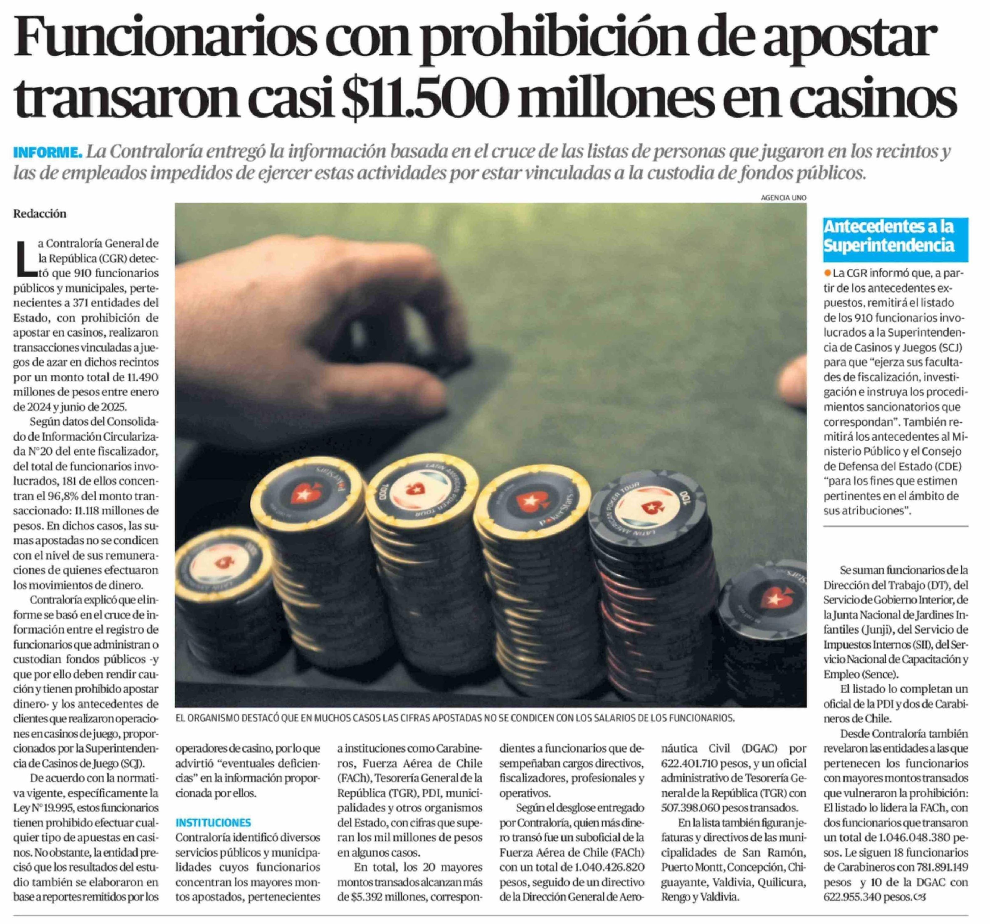 Funcionarios con prohibición de apostar transaron casi $11.500 millones en casinos