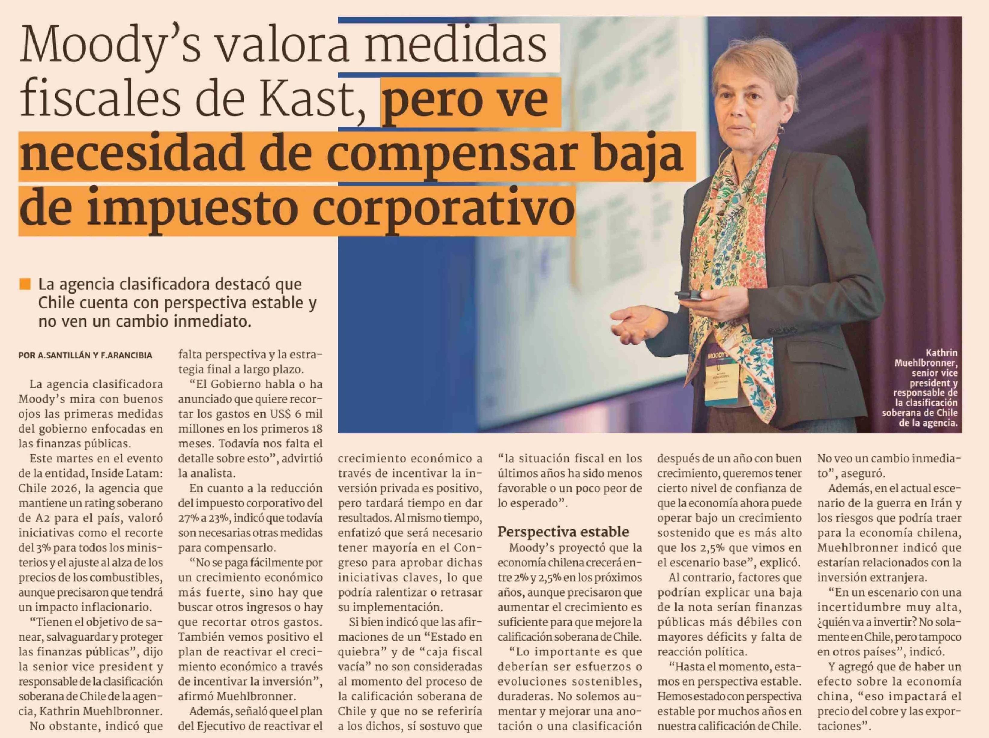 Moody's valora medidas fiscales de Kast, pero ve necesidad de compensar baja de impuesto corporativo |
