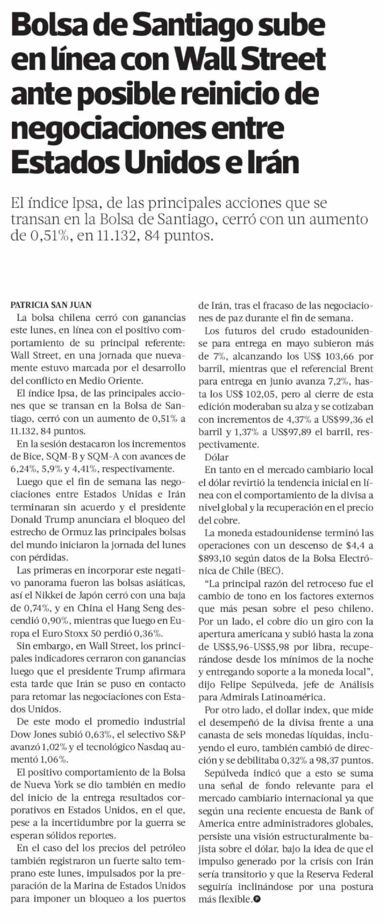 Bolsa de Santiago sube en línea con Wall Street ante posible reinicio de negociaciones entre Estados Unidos e Irán